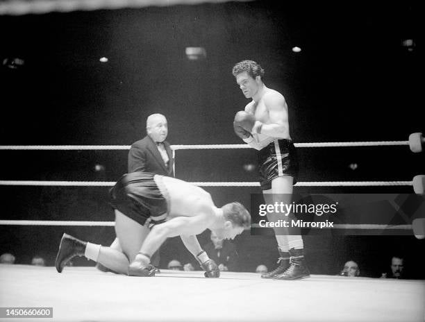 Great image from Howard Winstone vs Derry Treanor, Winstone stopped Treanor in the 14th round to defend his British featherweight title.