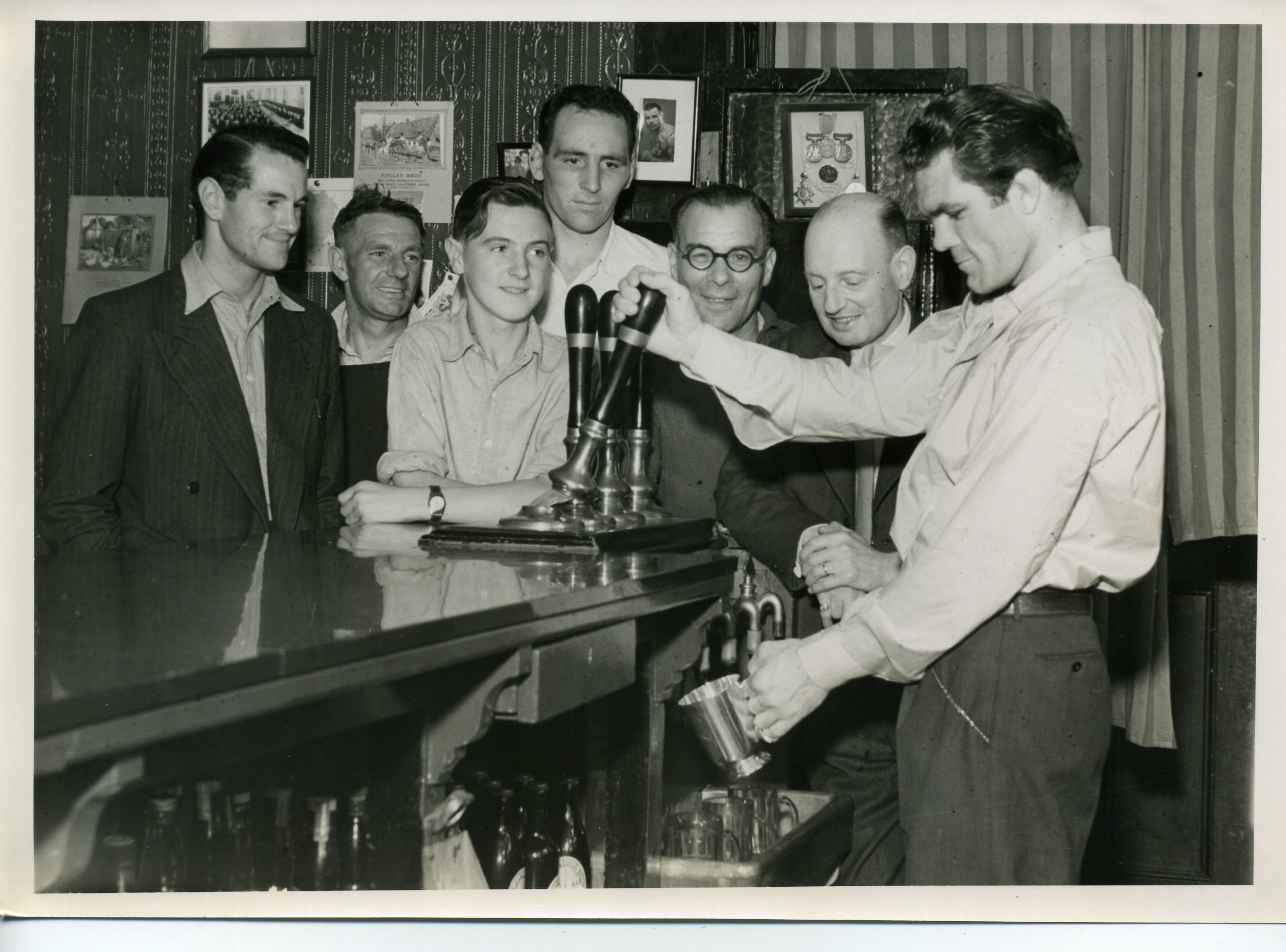 Howard Winstone (left) rolling a beer barrel at Merthyr Tydfil Brewery in South Wales, Winstone was employed there when he wasn't boxing.