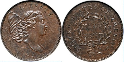 I think the 7070 albums only cover general types. The less common minor types are no included. My collection is almost "whole hog" although there are few minor types I will not get. For example, if you are really interested, you could have three 1794 half cent types. The design changed in a minor way during the year. I only have a 1794 and a 1795 half cent. Most people consider these coins to be the same type, Liberty Cap facing Right, but as you can see, they are different.