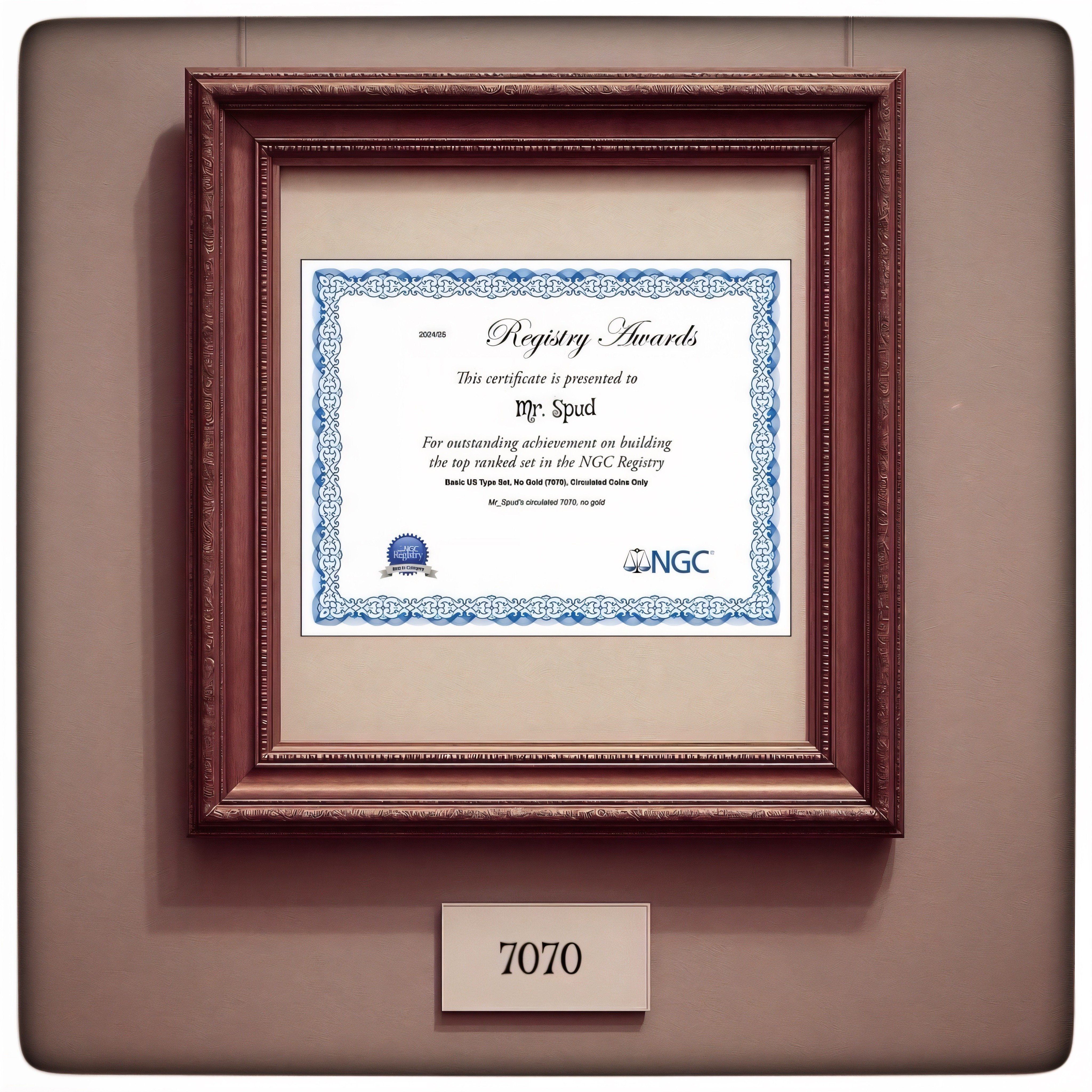 I never did the 7070 in a physical album, just virtual in the Registry across the street. It’s all circulated. I need to update my virtual coin album image to capture a few upgrades, but I just won an award again across the street for my circulated 7070 without gold Registry set. Here’s my certificate