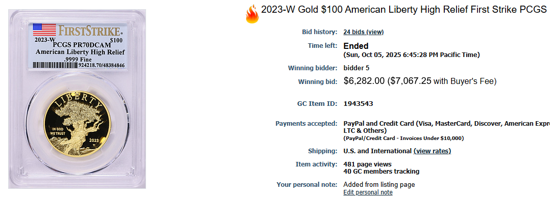 https://www.greatcollections.com/Coin/1943543/2023-W-Gold-100-American-Liberty-High-Relief-First-Strike-PCGS-Proof-70-DCAM