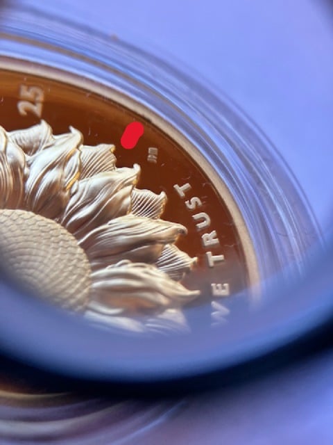 I don't want to detract from this interesting conversation, but my first coin that just arrived has a flaw. A blackened area on the inner matte gold "bezel" inner edge (for lack of better words). Located between the numeral 25 and the engraver's initials. Marked up by a red line. The black flaw is at the head of the red line. My second coin arrives tomorrow. If it ain't perfecto, it gets the boot. This pictured coin is definitely a grade 69, so trizzle trazel, trizzel, trome... time for this one to go home.