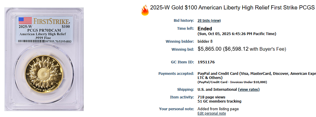 It’s the very reason I am not pushing the button to buy more 2025-W HR coins right now. I can buy collectible American proof gold eagles these days right around spot or even 1% or 2% back of spot! I personally think that pile may outperform the 2025-W HR at today’s prices. I’ve been wrong before and I might be wrong again. Hundreds of other folks are buying up the 2025 HR coins as we speak. It will be fun to see how I performed on all my different gold buys a few years from now (including the recent gold Space coin, mintage 7 to the public, auctioned by the Mint).