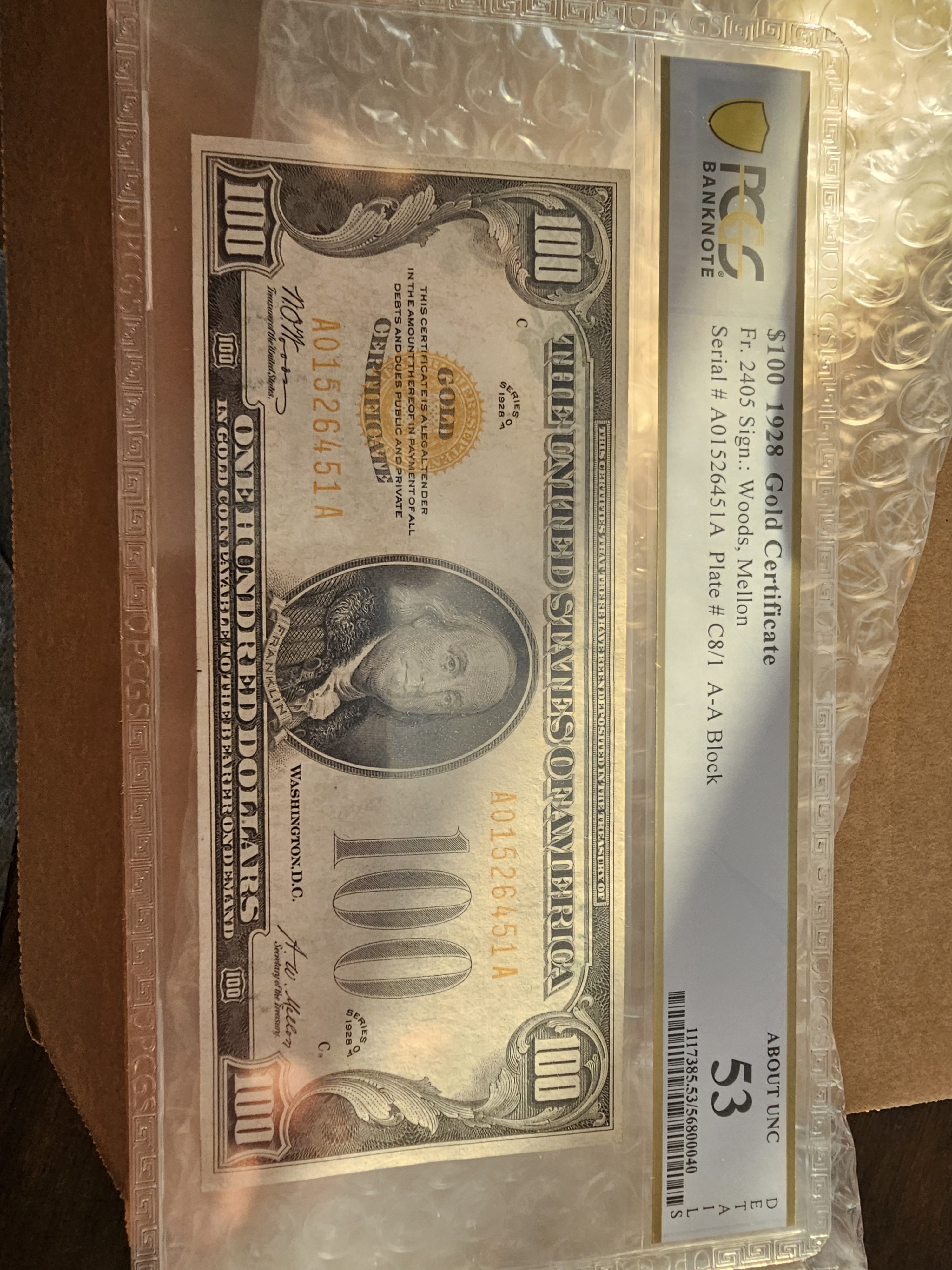 That's hard to believe...even if his specialty is coins and not currency, he knows it's a face value of $100 and Gold Certificates -- hell, ANYTHING with gold in it :) -- is valuable. I'm not an expert on GC's but I knew even at the low-range of my grade estimate this thing was worth at least 4-figures.