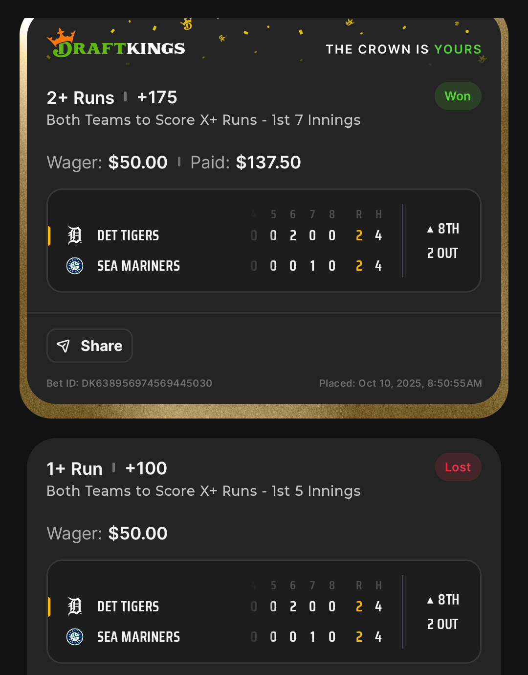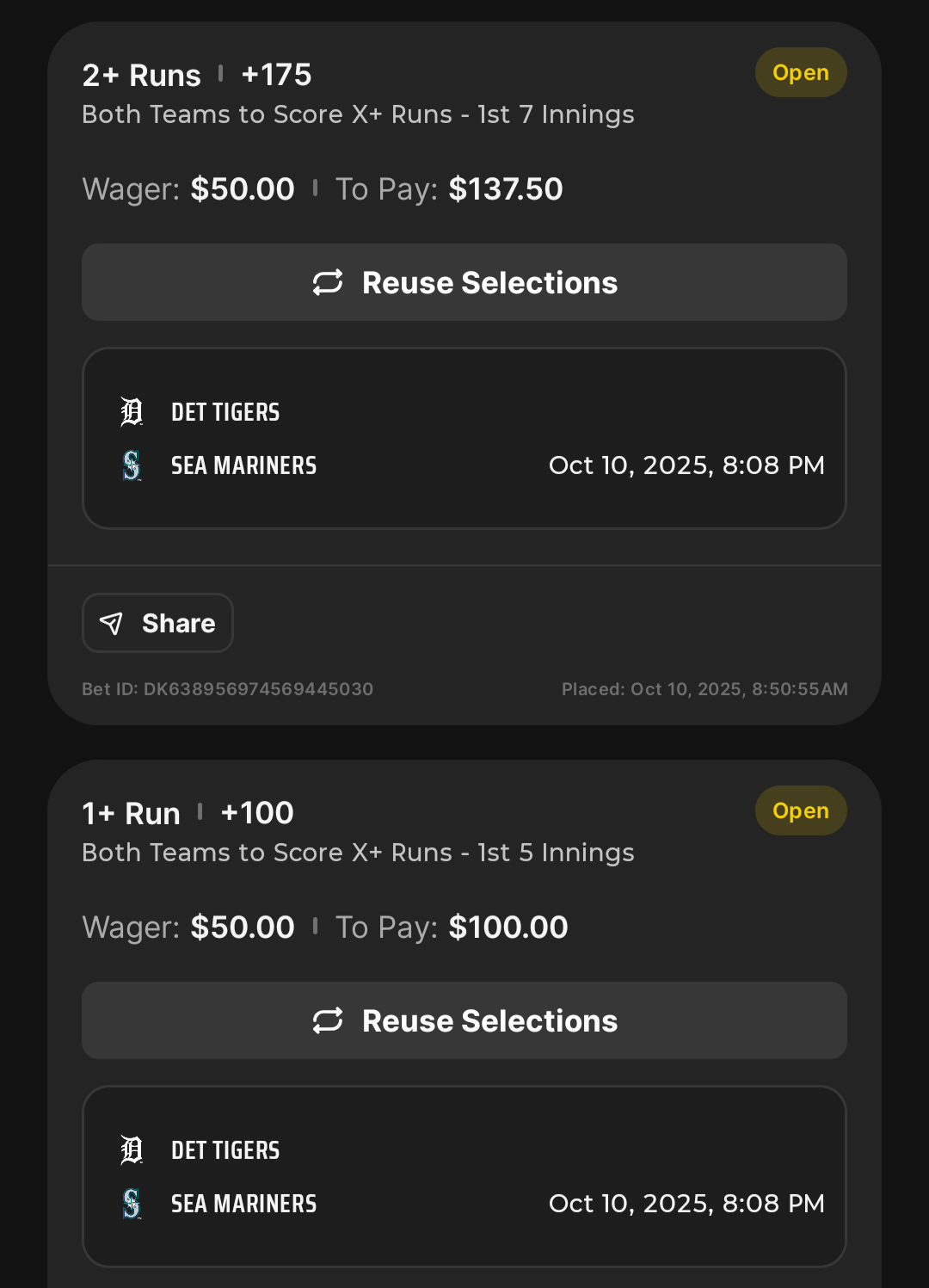 Don't get me wrong I fully expect to lose one if not both of these bets but call me insane for not taking plus money on these teams to at least manufacture 1 freaking run through 5 and possibly 2 through 7