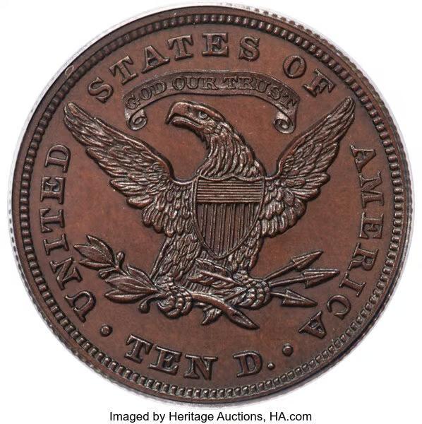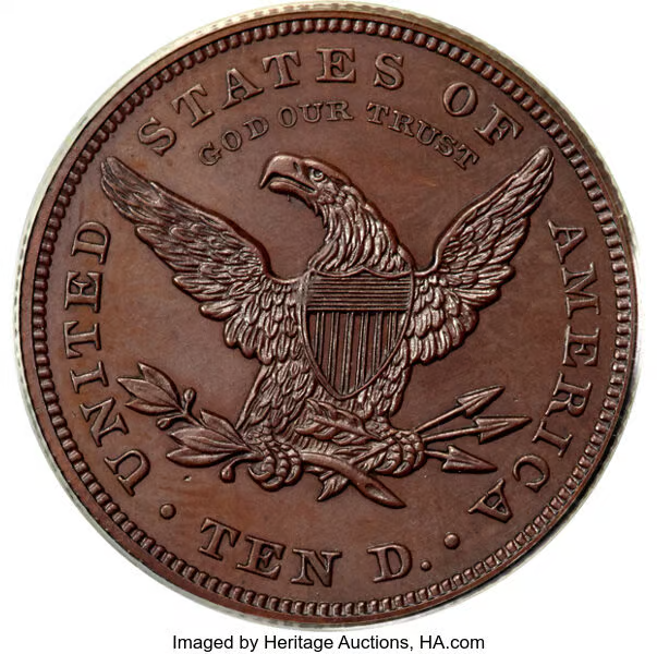 Morgan said "this die with the deep serratures inserted by hand and with the feathers of the eagle's wing continued on the under edge of the body was the first model, and that subsequently, in deference to the idea and wishes of the Committee on Coinage, changed the arrangement of the feathers so as to leave a gap in the under edge between the feathers and the body."
