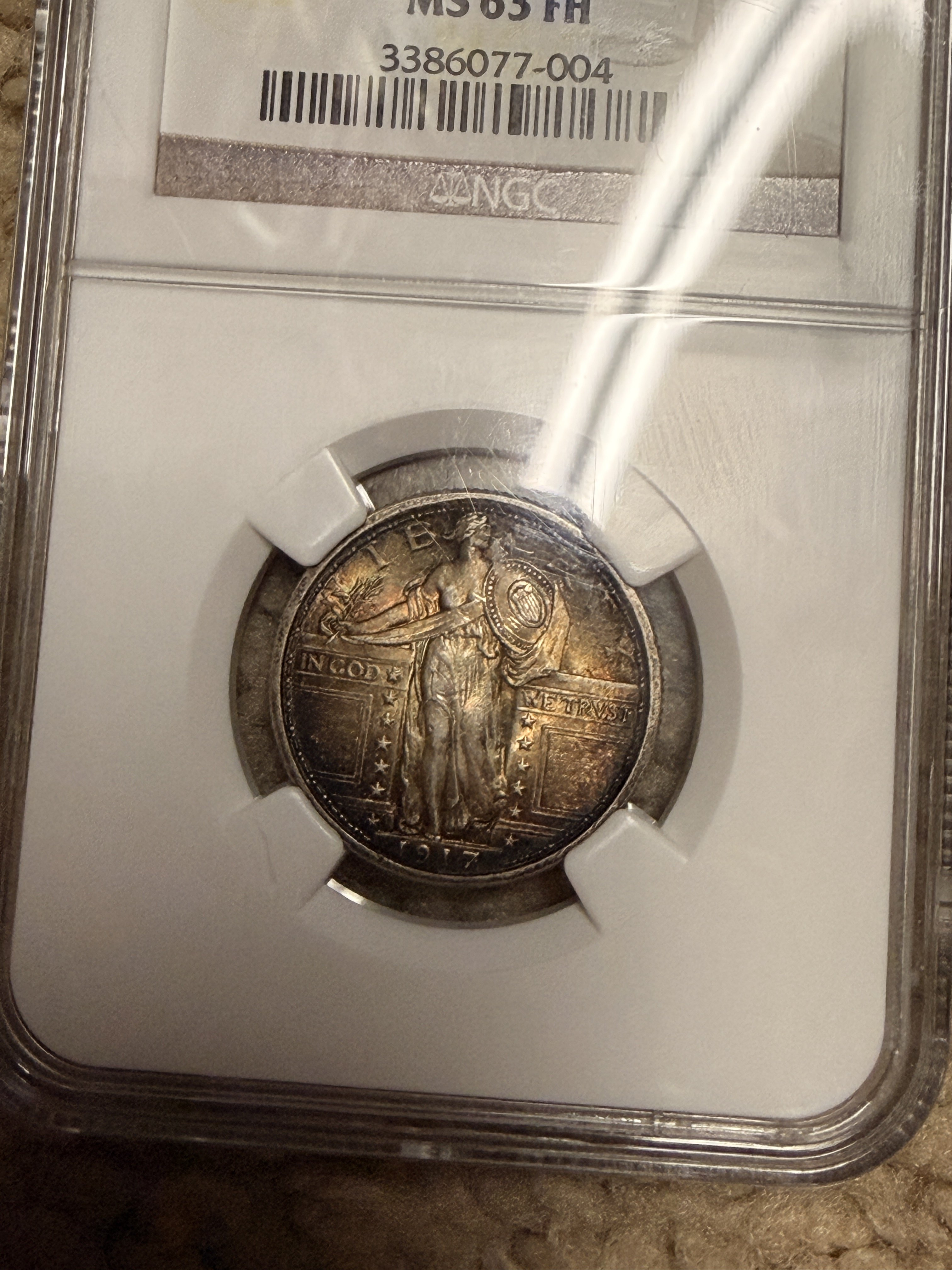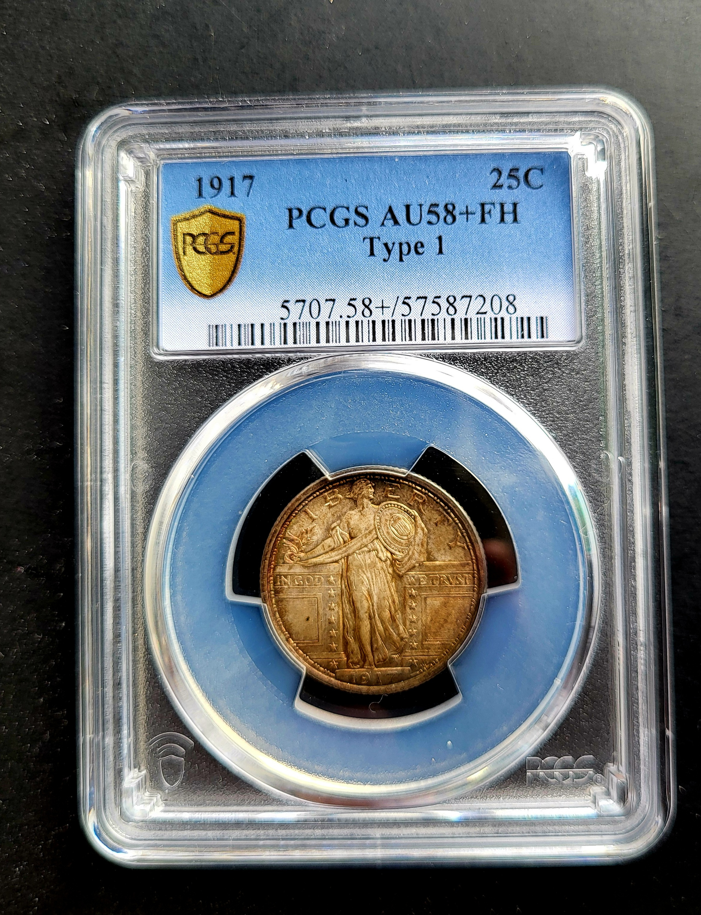 I guessed AU58FH because to me, it looks like there’s rub at Liberty’s midsection, her sash, major portions of each leg and her gown above the W in WE, among other areas. That said, it’s possible that the lighting is merely giving that impression.