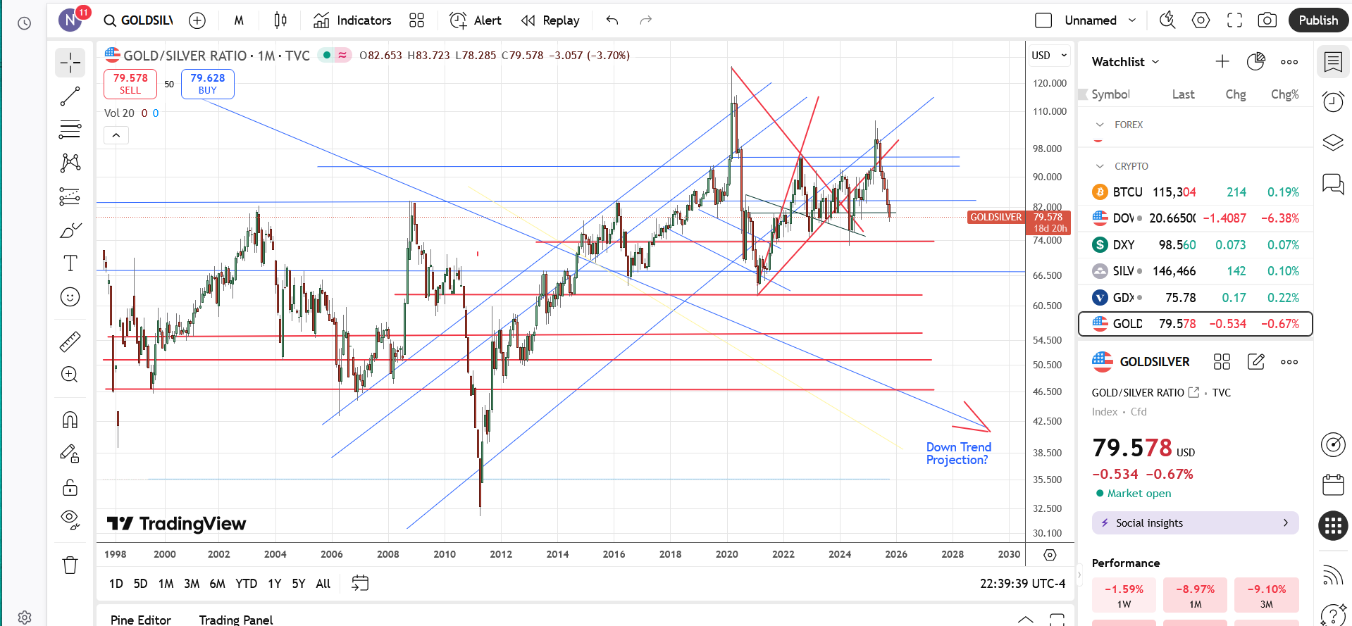 GSR at 55 was a support point over the past 25 yrs. I have a good feeling that it will get hit again. And 45 is another major support. I would agree that GSR has had trouble breaking below the 83 support point for quite some time. Silver is often late to the ball game though. GSR has a central trading range of 45-83 over the past 17 yrs. It's back under 80 and has been clinging to the bottom of the up channel for 4 years. If it breaks down from the up channel....45/55 are reasonable targets. Following the 2020 GSR peak it looks to me like GSR is in a corrective ABC pattern with the C leg possibly just beginning. 73 is the next key Support/Resistance line going back 10 yrs. If that breaches, it's headed to the 50's. The 83 support/resistance line goes back 20 yrs. IF GSR manages to go back above that with any strength, then more problems for silver. I'm watching that lower "projection" ARROW formed by the bottom of the 2015-2020 rising wedge.