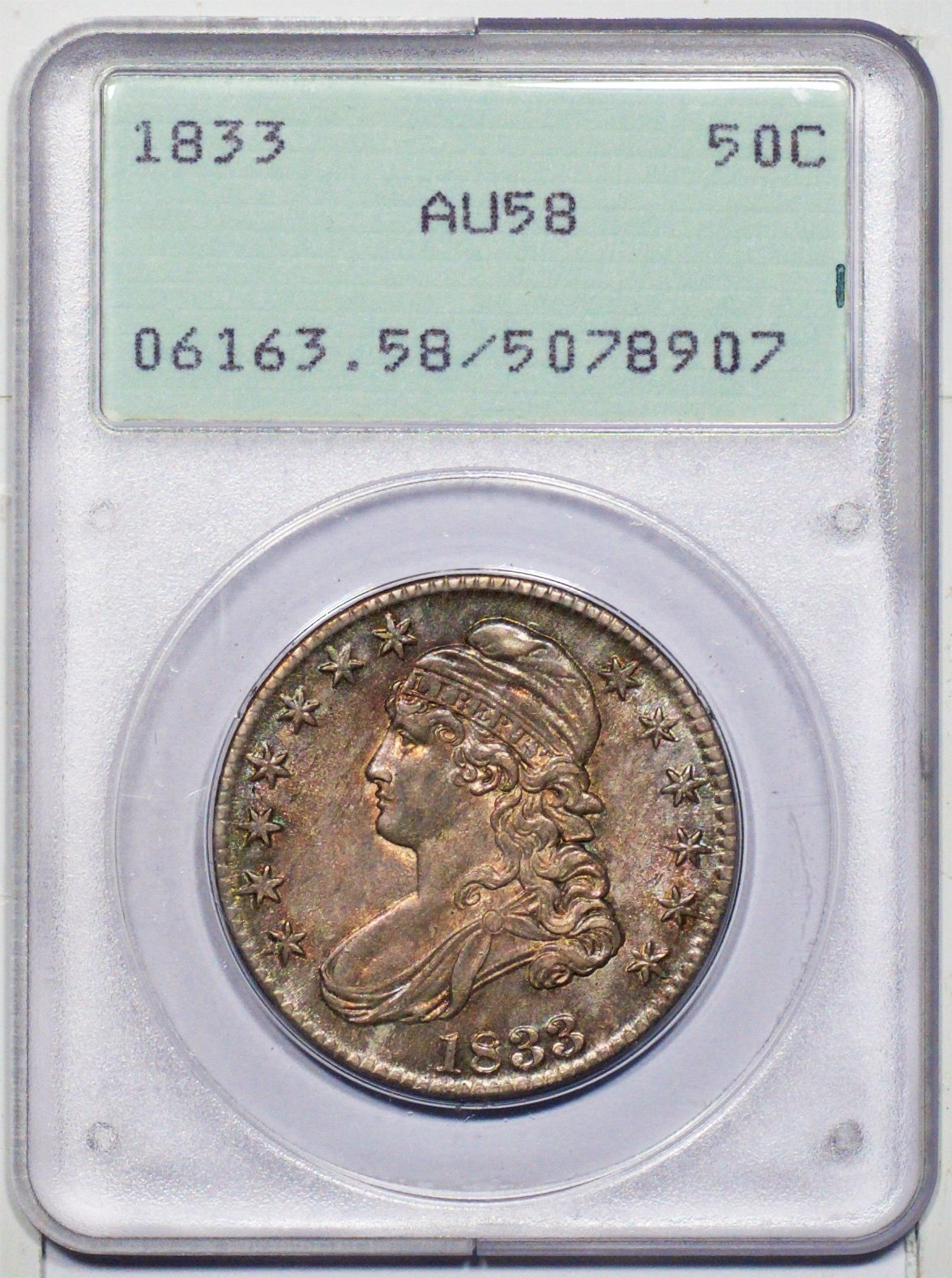 My first win at a Sheridan Downey Mail Bid auction was an 1833 CBH P58CAC Rattler - sticker applied after photo (first time holding a Rattler). That got me hooked on the slab. I have always liked Rattler holders. The problem has been finding affordable Classic Heads and Early gold in them.