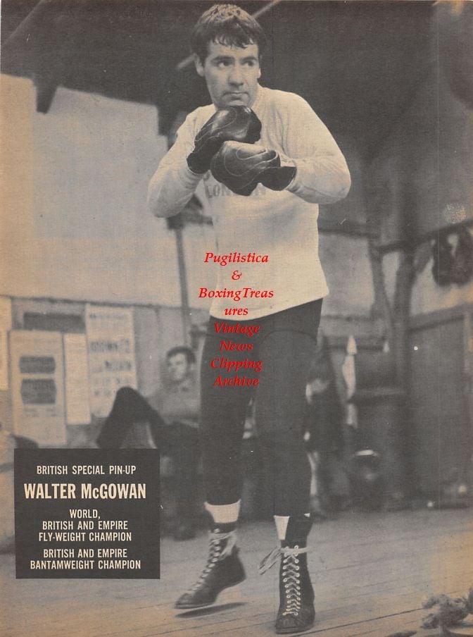It was on June 14, 1966, when Walter McGowan, well ahead by the seventh round of his world WBC flyweight title clash against Salvatore Barruni, sustained a gashed eye of sufficent severity to warrant the close inspection of English referee, Harry Gibbs. But McGowan shrugged off the handicap to box, as one ringside ring critic put it "like a little master. Using his speed, jabbing in clusters and bringing the right hand home." These were the boxing skills which brought him victory and Scotland her fourth world flyweight champion.