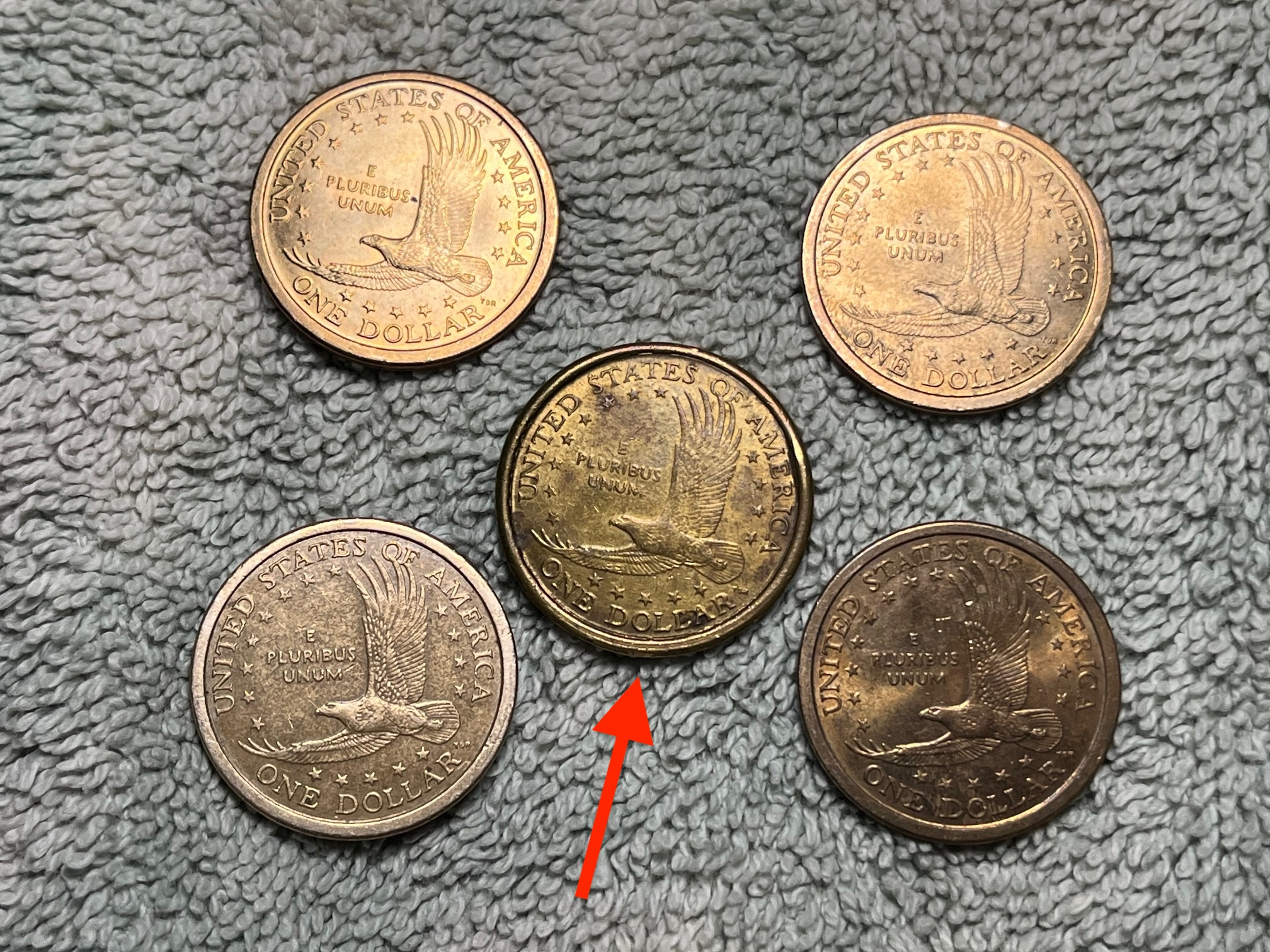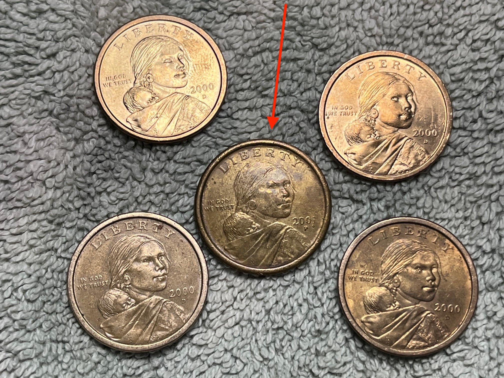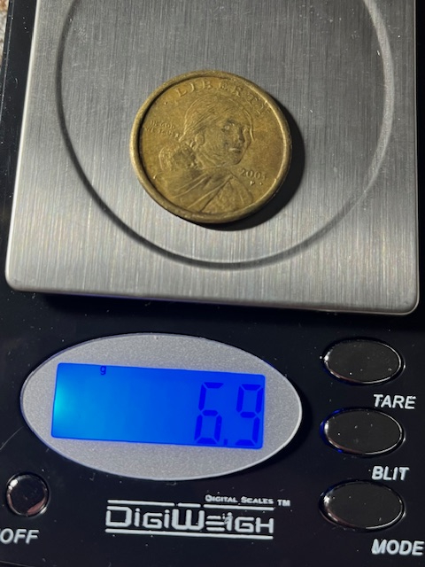 I can barely see and read the caliper. The one on the right is the counterfeit. The one one the left is a normal Sacagawea. I guess this tells us they are both the same diameter.