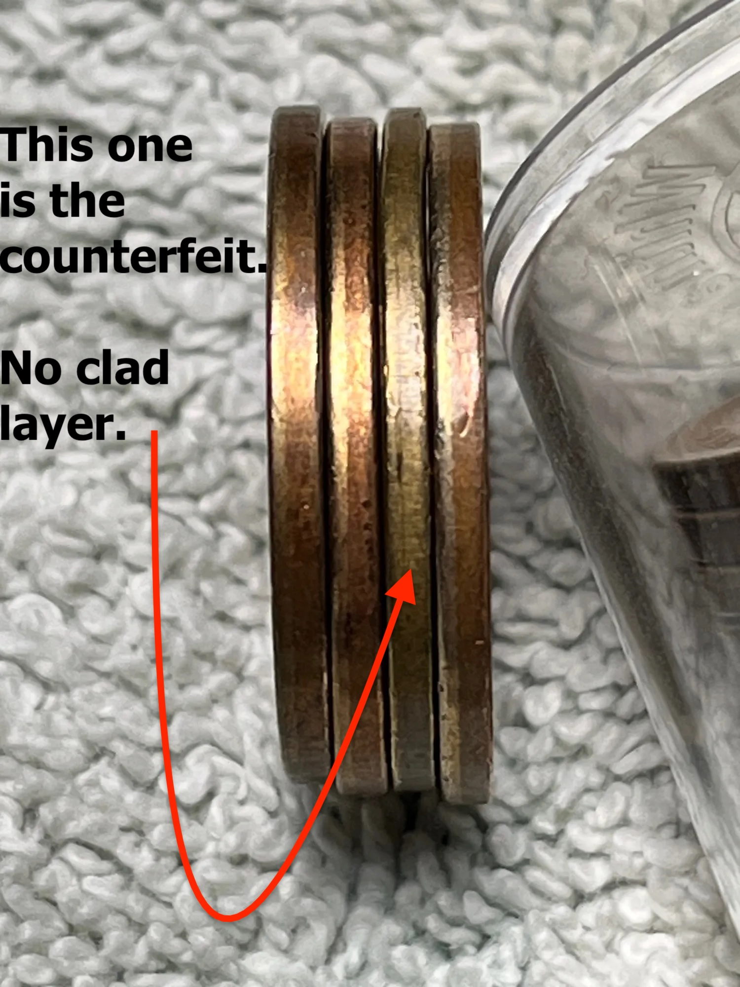 using the edge comparison photo, the two inner coins are closest aligned. counterfeit on right and real on left. it is a tad larger in diameter and a tad thinner at the rim