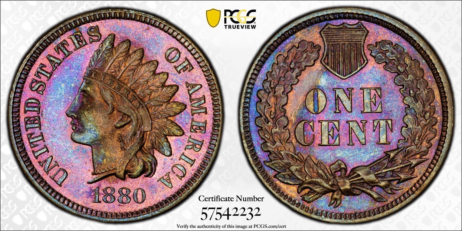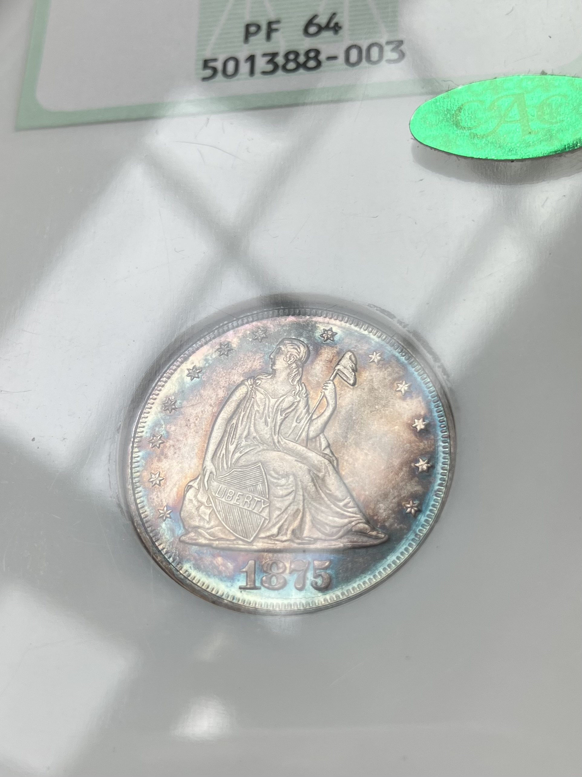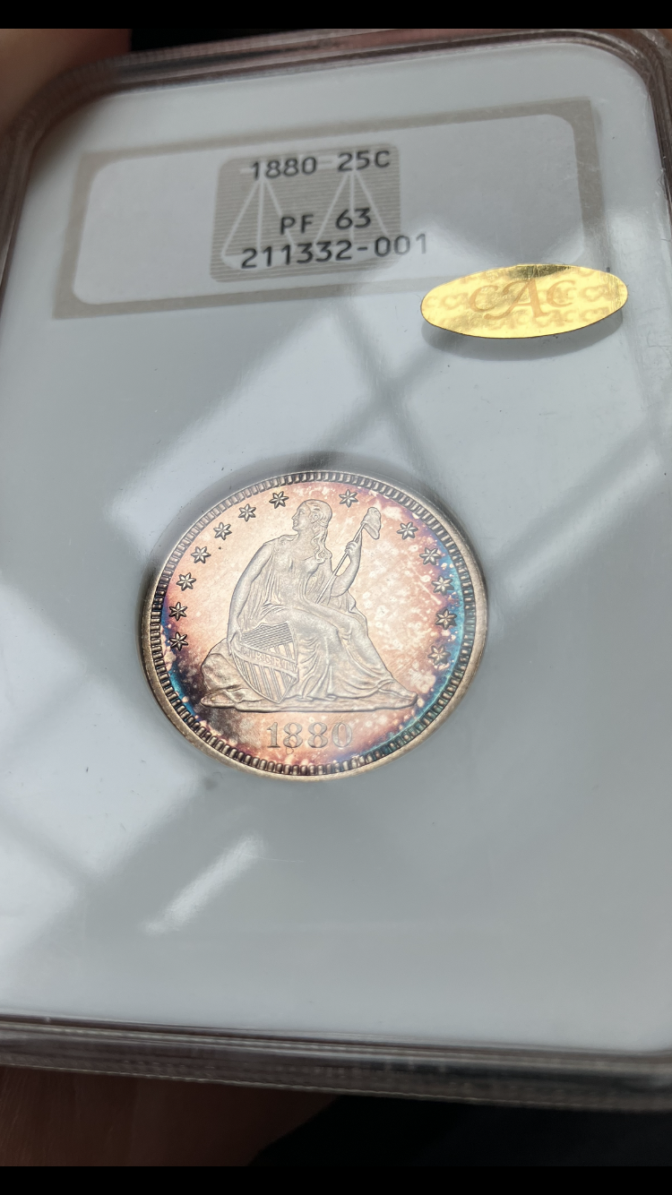The tone on the reverse of this 1880 seated quarter (PR63, CAC Gold, NGC Fatty) is quite spectacular in hand. The obverse color is a tad more muted.