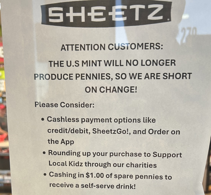 Slightly off topic but somewhat relevant. Stopped at Sheetz yesterday for an early morning coffee and saw this on the door. Looks like they are already having trouble getting pennies.