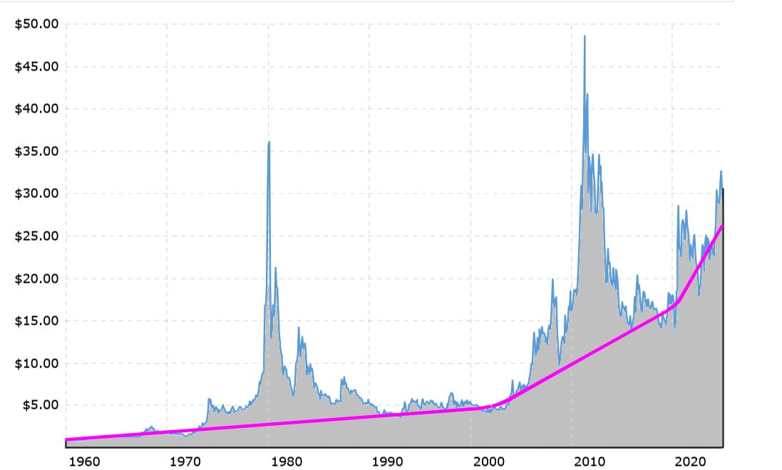 I posted this silver price chart on this forum a couple years ago. The point I was making was a suggestion to buy silver when it was near the magenta line, not during one of the price spikes. The general trend is a reliable comparison, not individual price spikes up or down.