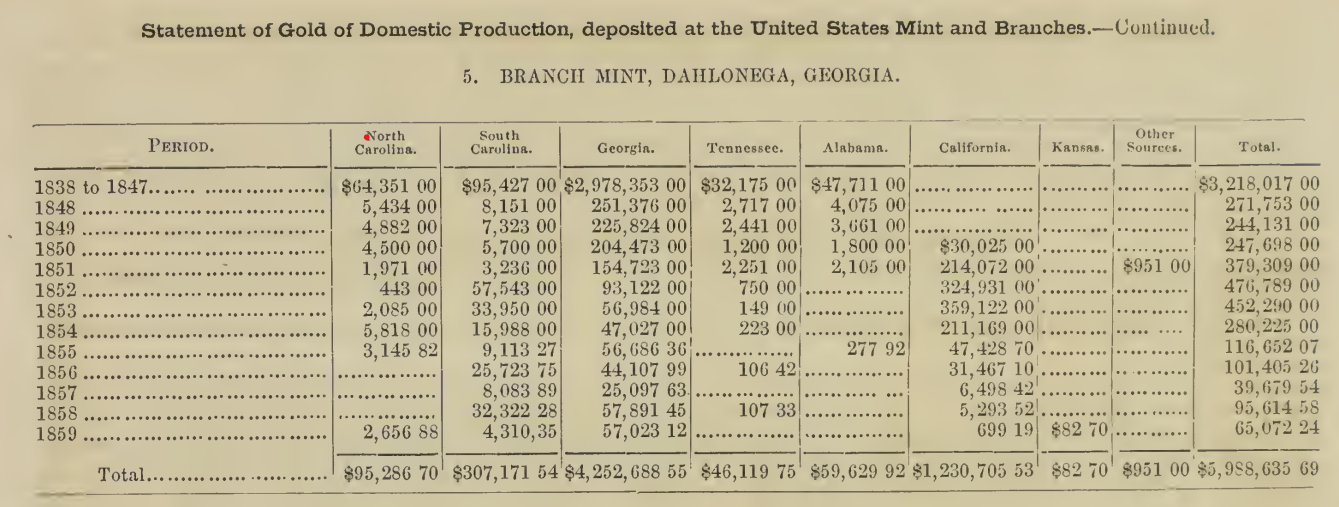 The story was a bunch of miners left Dahlonega for California in search of greener pastures. After finding some California gold, some came back to Dahlonega brining their gold with them. According to the sources I have read to peak year for submitting California gold at the Dahlonega Mint was 1853. The mintage for $5 gold coins seems to support the fact that gold was coming from more sources in addition to the Dahlonega area goldfields.