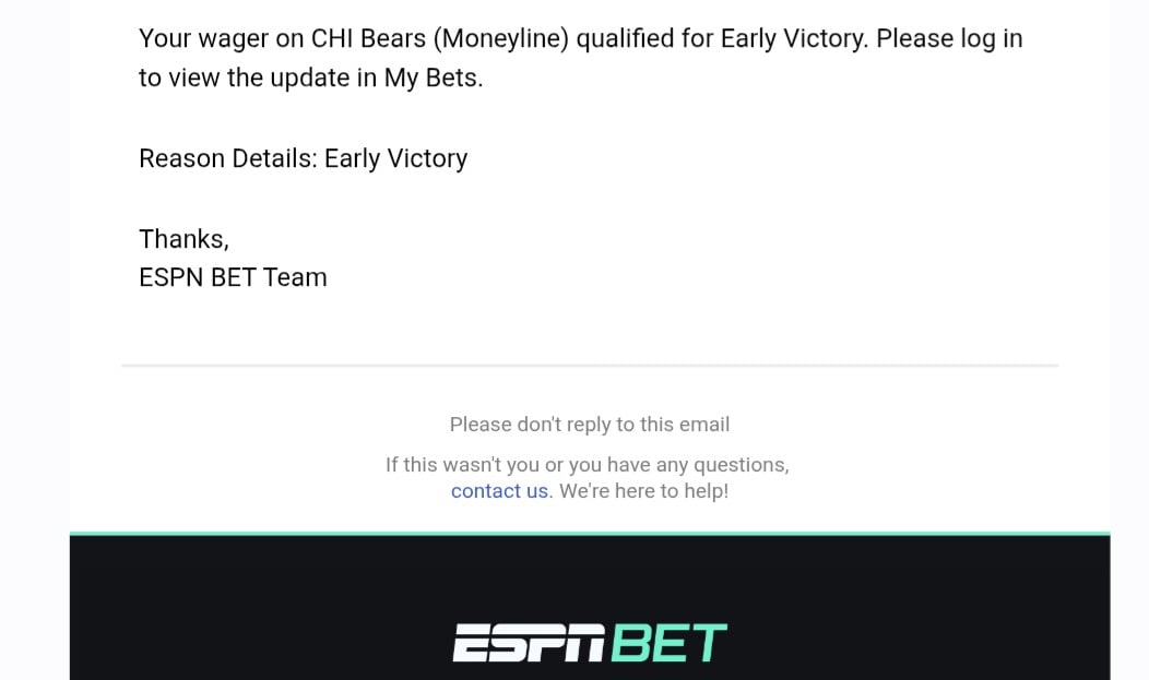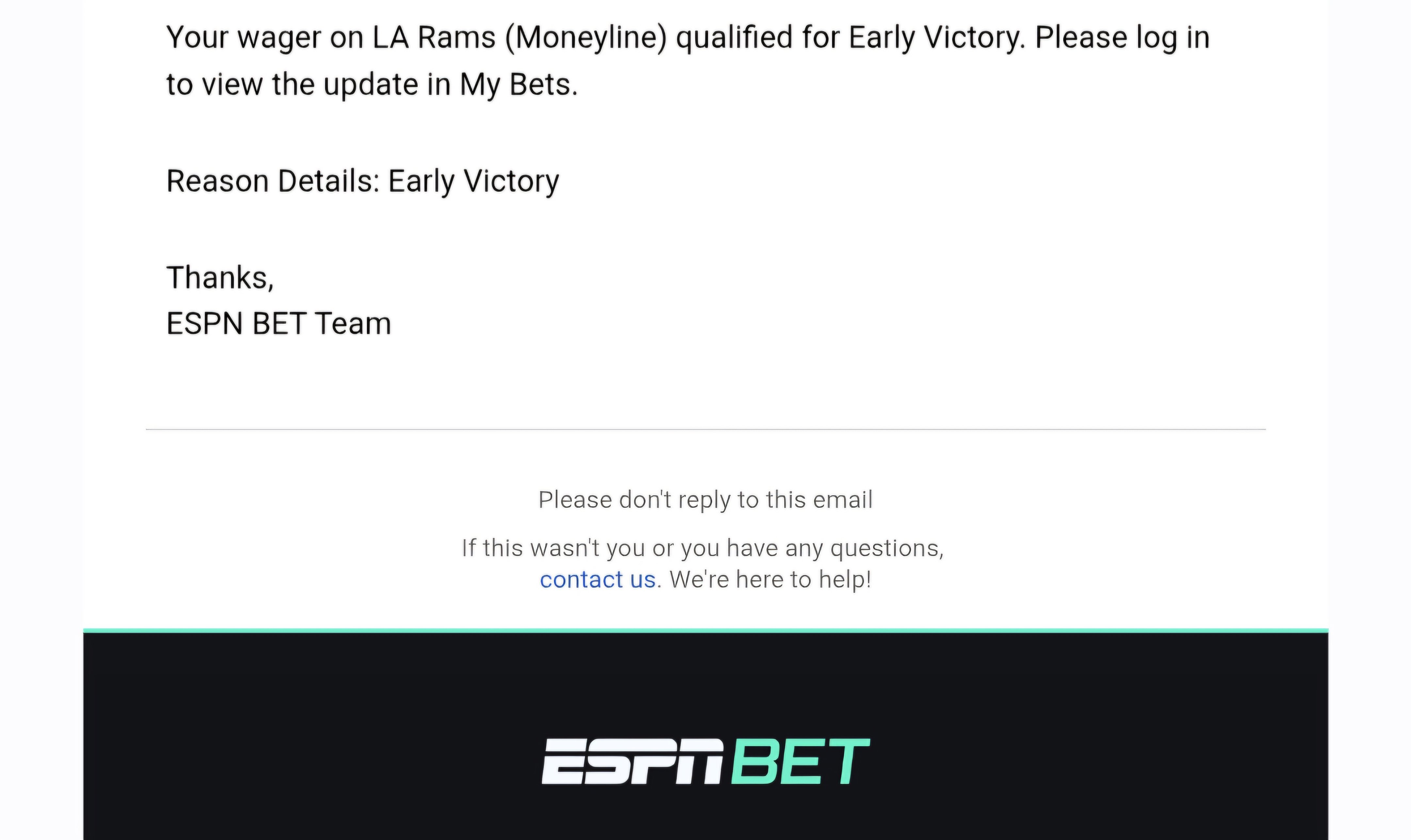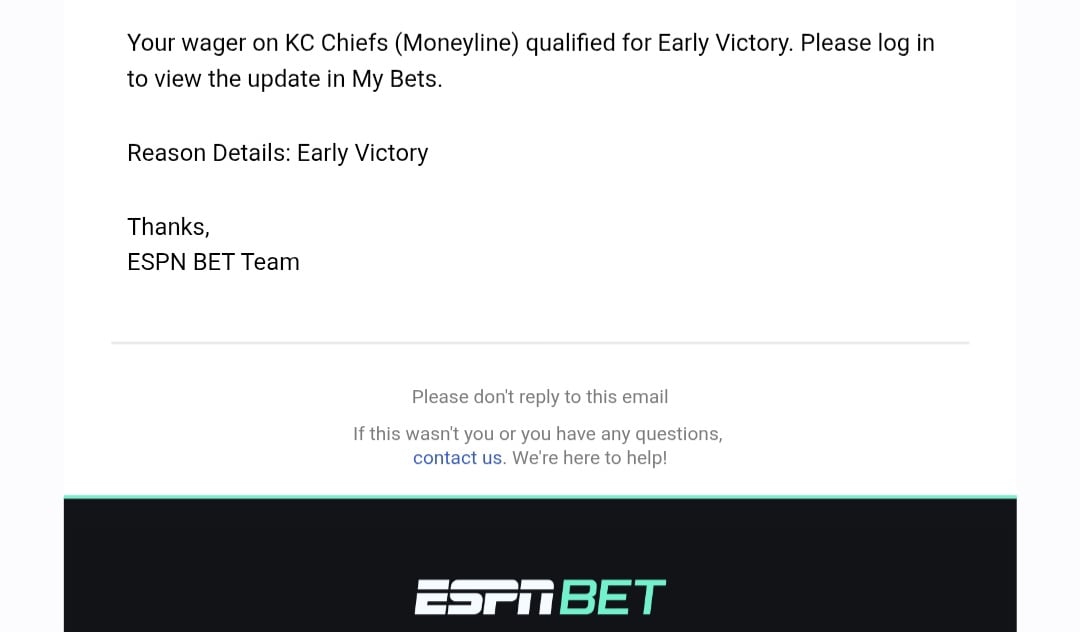 I haven't yet figured out which games they do the early victory for, or what the threshold is to declare the early victory, but ESPN BET has been paying me early on quite a few games this year. I believe the Dolphins 2 weeks ago are the only team that eventually ended up choking the lead away.