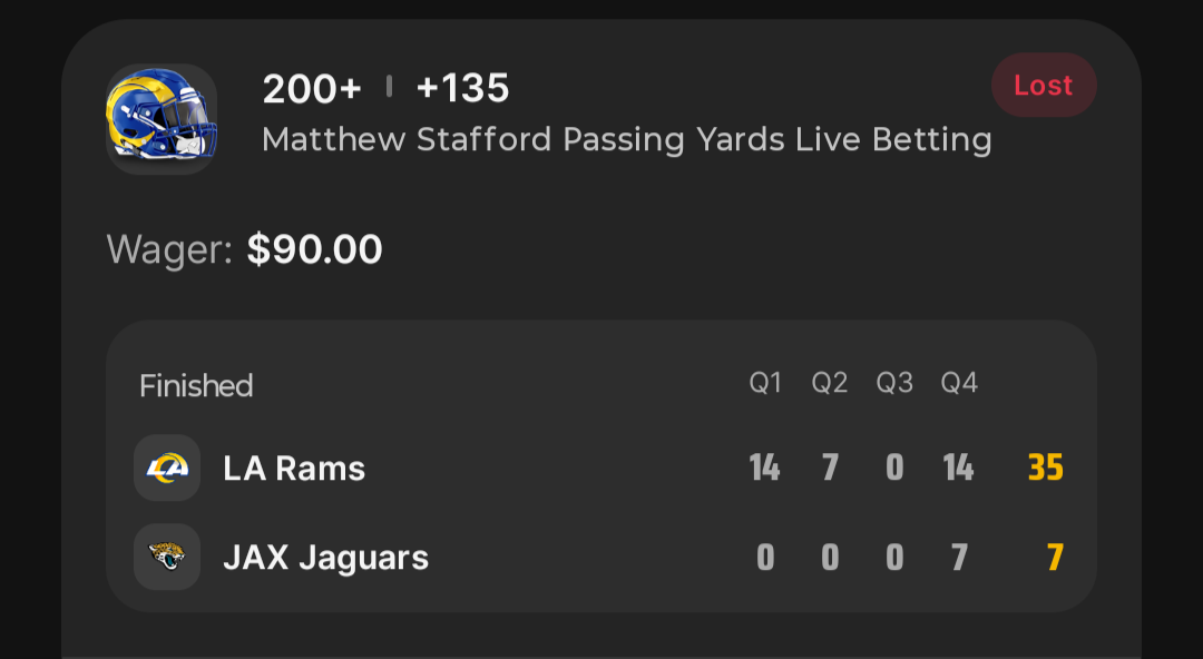 Came close to making a live bet on the Jags at +20.5 at the end of the third quarter. Maybe catch a win both ways. Rams just scored a TD. Glad I didn't do it.
