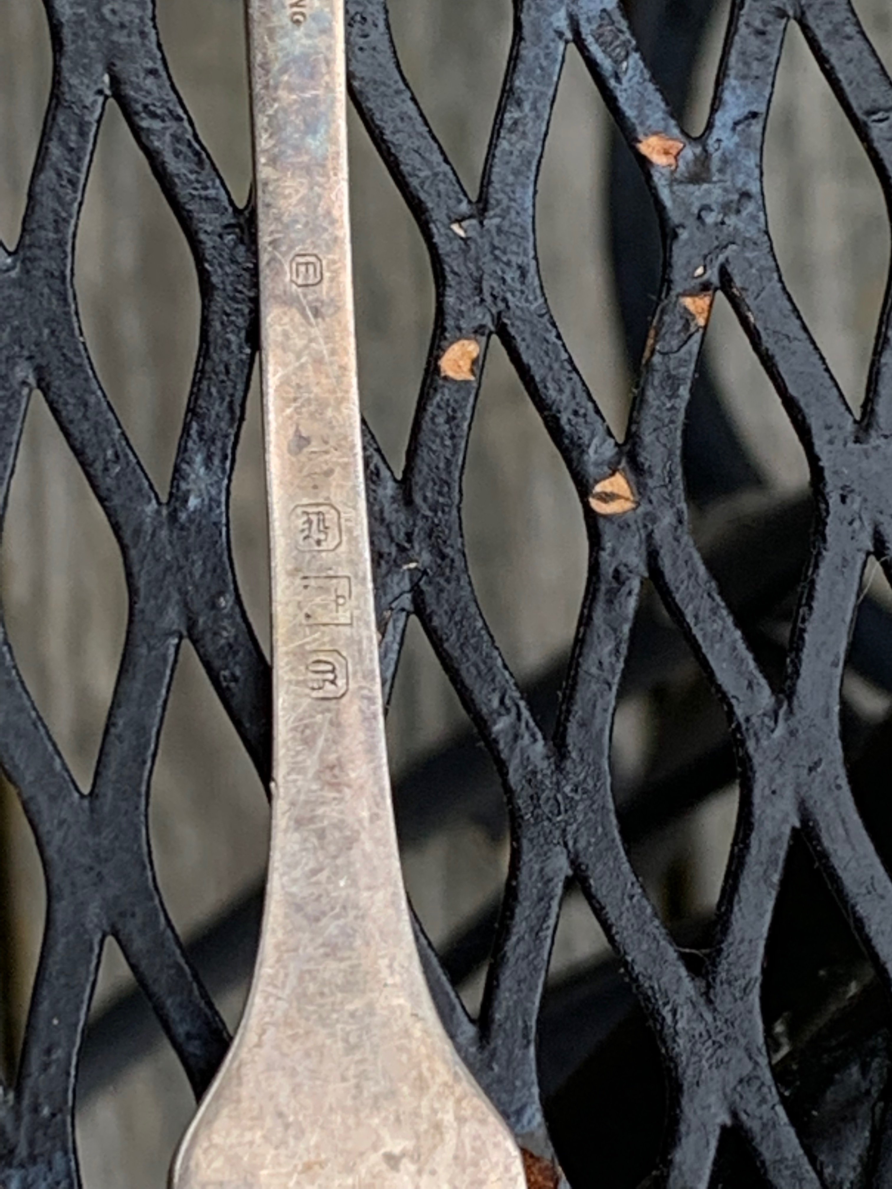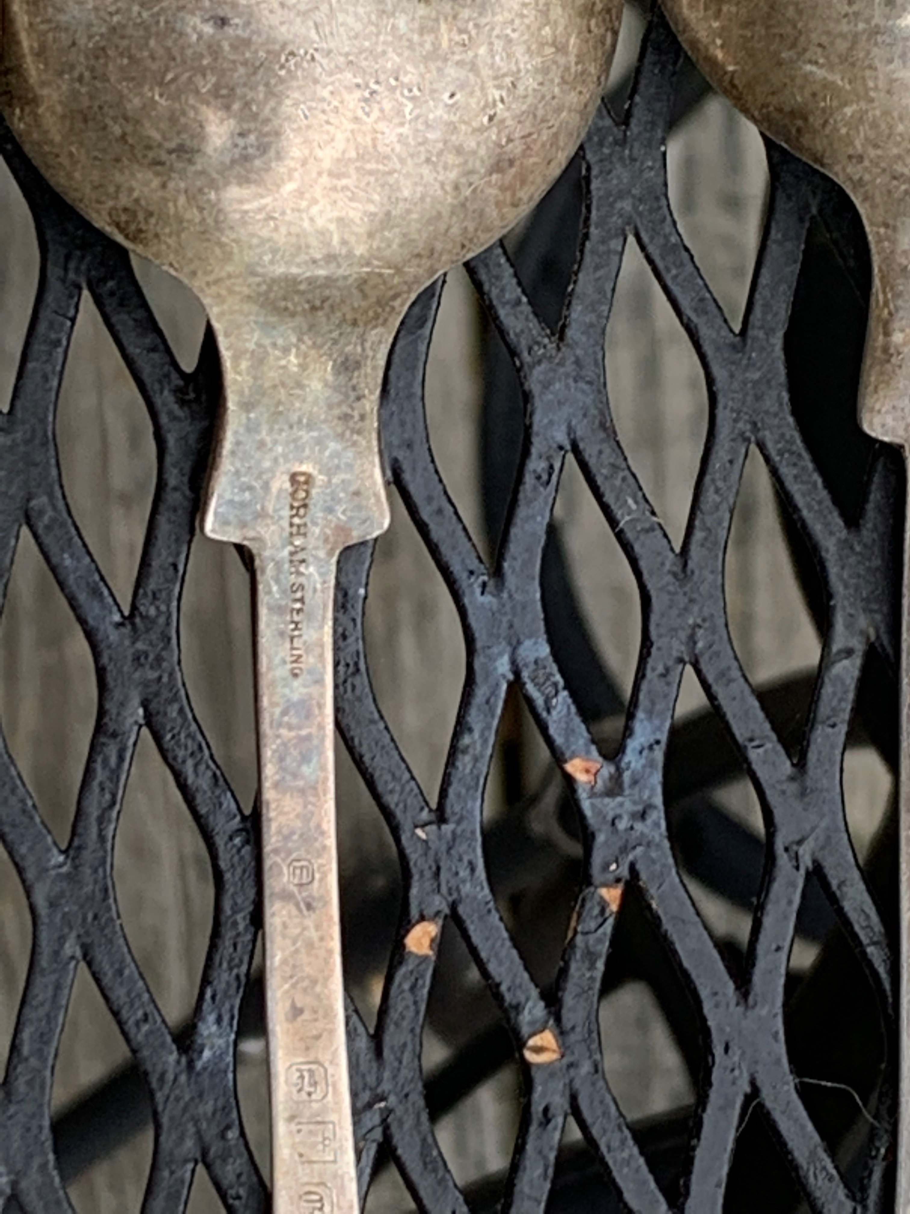 Sterling .925% silver in an Interesting primitive pattern. Craftsmanship and Design: Ornate patterns like Chantilly, Strasbourg, and Buttercup are highly collectible and often worth significantly more than their silver weight. For fun you might see if your local library has access to GORHAM SILVER by Charles H. Carpenter.