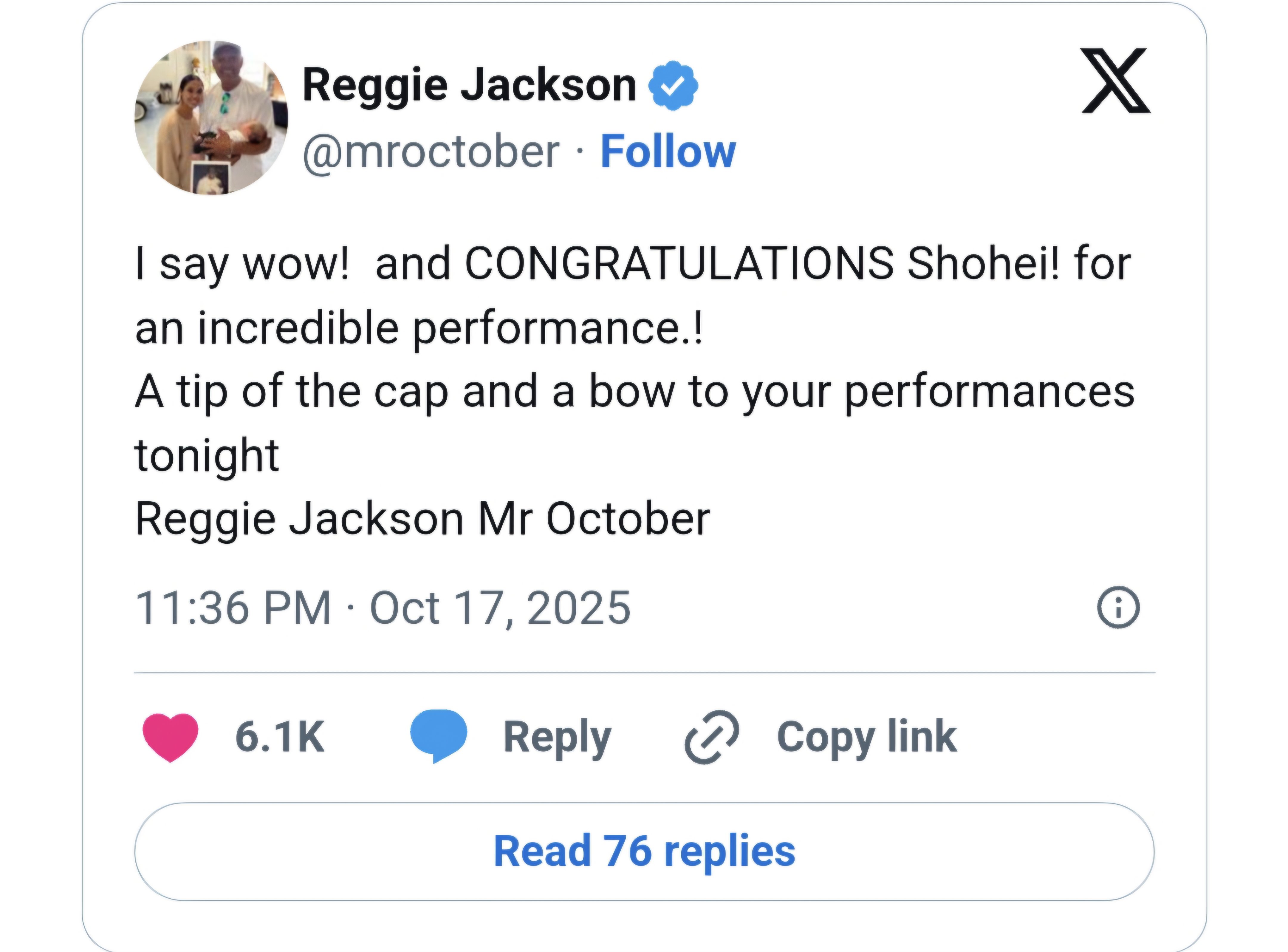 I think if you want to say the hitting performance by Reggie was superior, okay debatable. I get it. Probably true that it was. But to suggest that throwing 6 innings 2 hits 0 ER 10Ks, in additon to hitting 3 HRs, does not tilt the field in a landslide way I dont think that is even a discussion or a debate. Its pretty much a fact Shohei had a more impressive playoff game, the most impressive game ever and I dont think its even close.