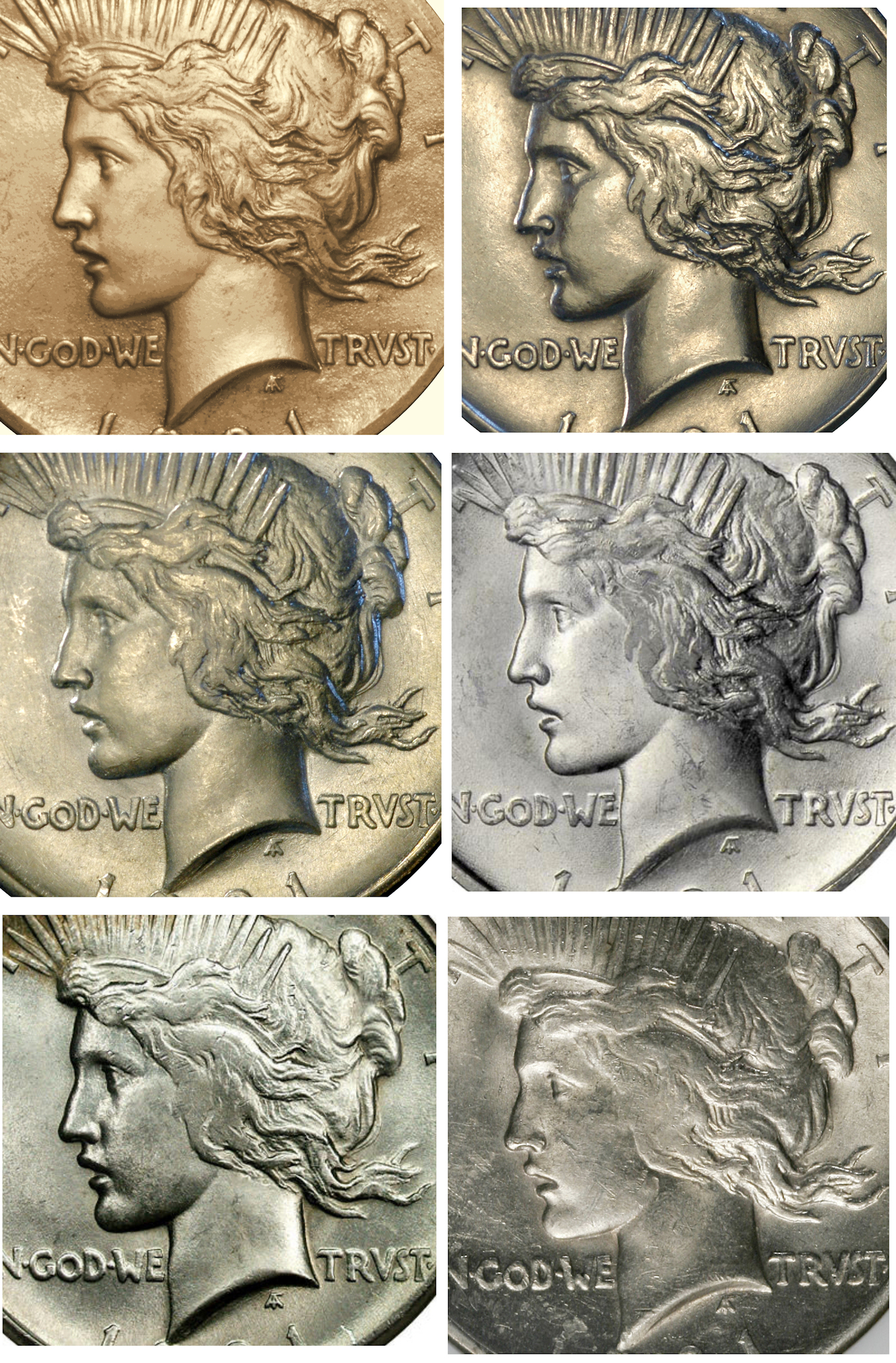 The six coin composite shown in several posts is incorrectly identified. The image was copied, without attribution, from A Guide Book of Peace Dollars, Whitman Publishing LLC, by Roger W. Burdette. If the illustration had been properly attributed, members could have access the book and been better informed for the posted discussion.
