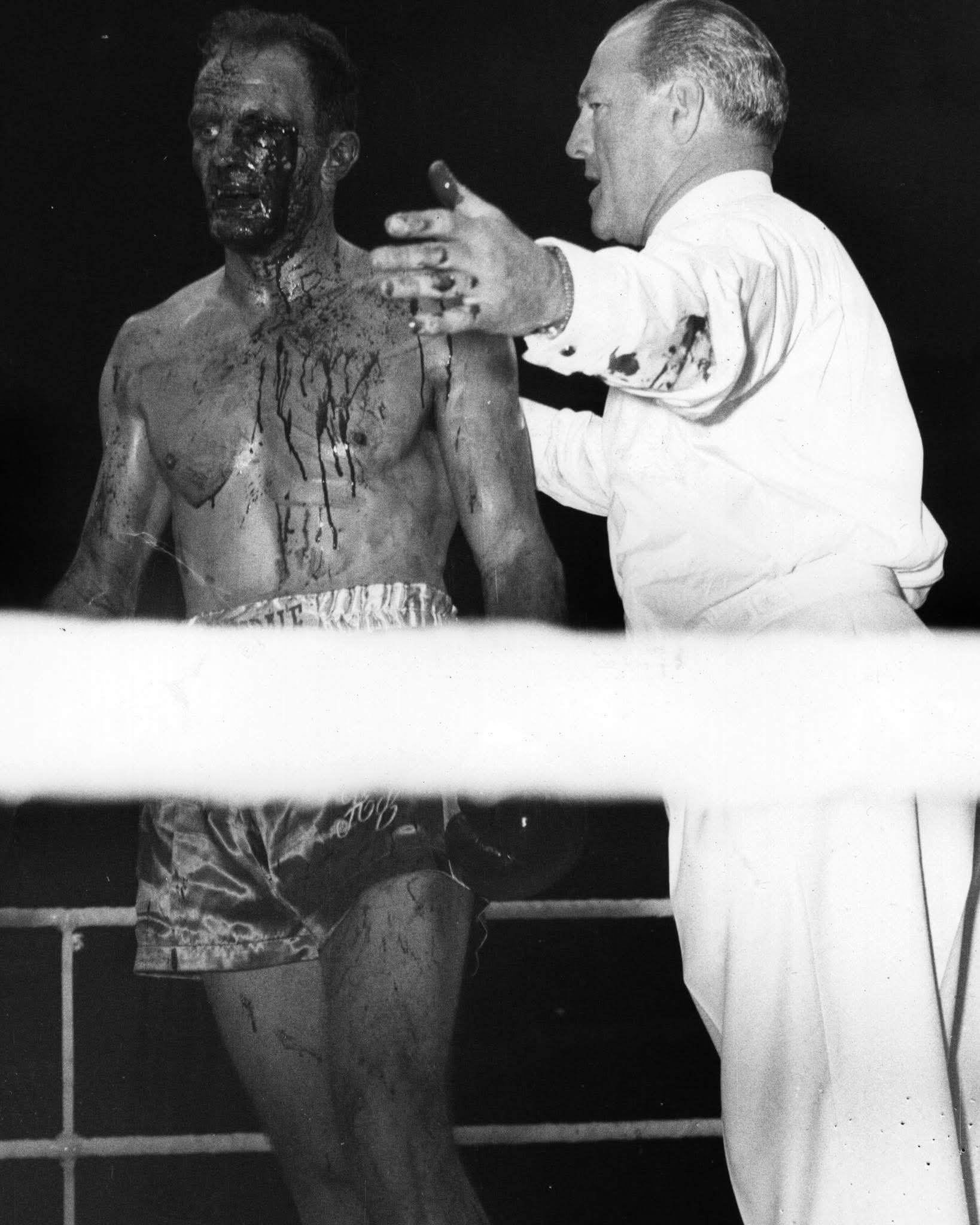 Suffering bleeding of the eye so bad he couldn’t see, Henry Cooper is told enough is enough after five rounds against Muhammad Ali in 1963. Cooper protested and did not want the fight to be stopped, but to no avail.