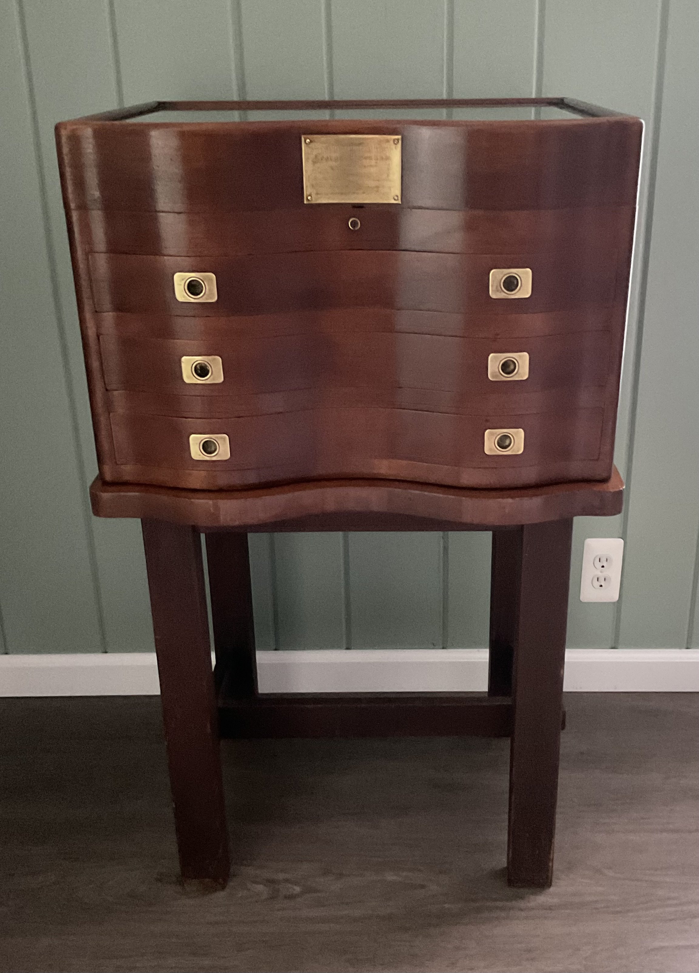 The brass plaque on the front reads…