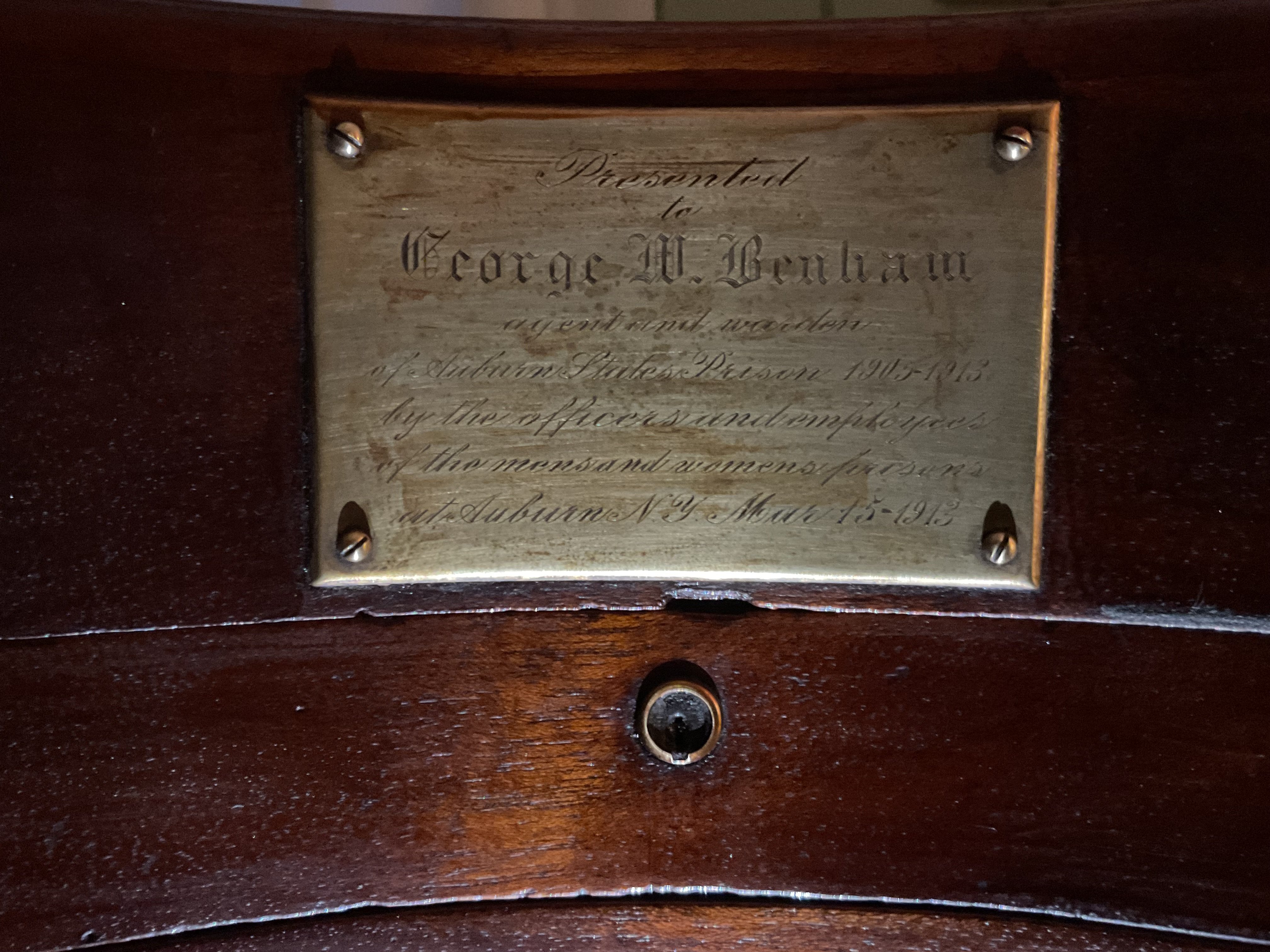 This was a gift to George W. Benham who was the warden of Auburn State Prison in New York from 1905 to 1913.