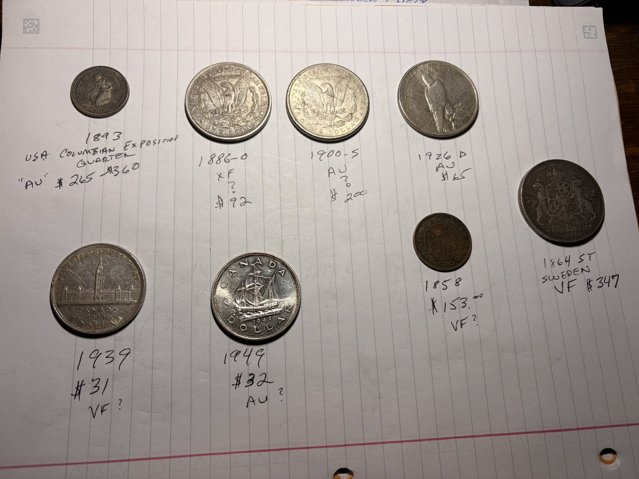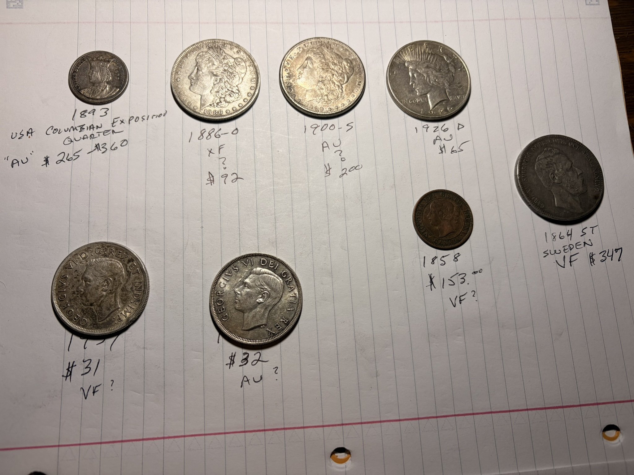 1 1893 Columbian Exposition quarter (the app says "AU" $265-$360) Google says average circulated is $20-30 but even at VG could still be $200...?