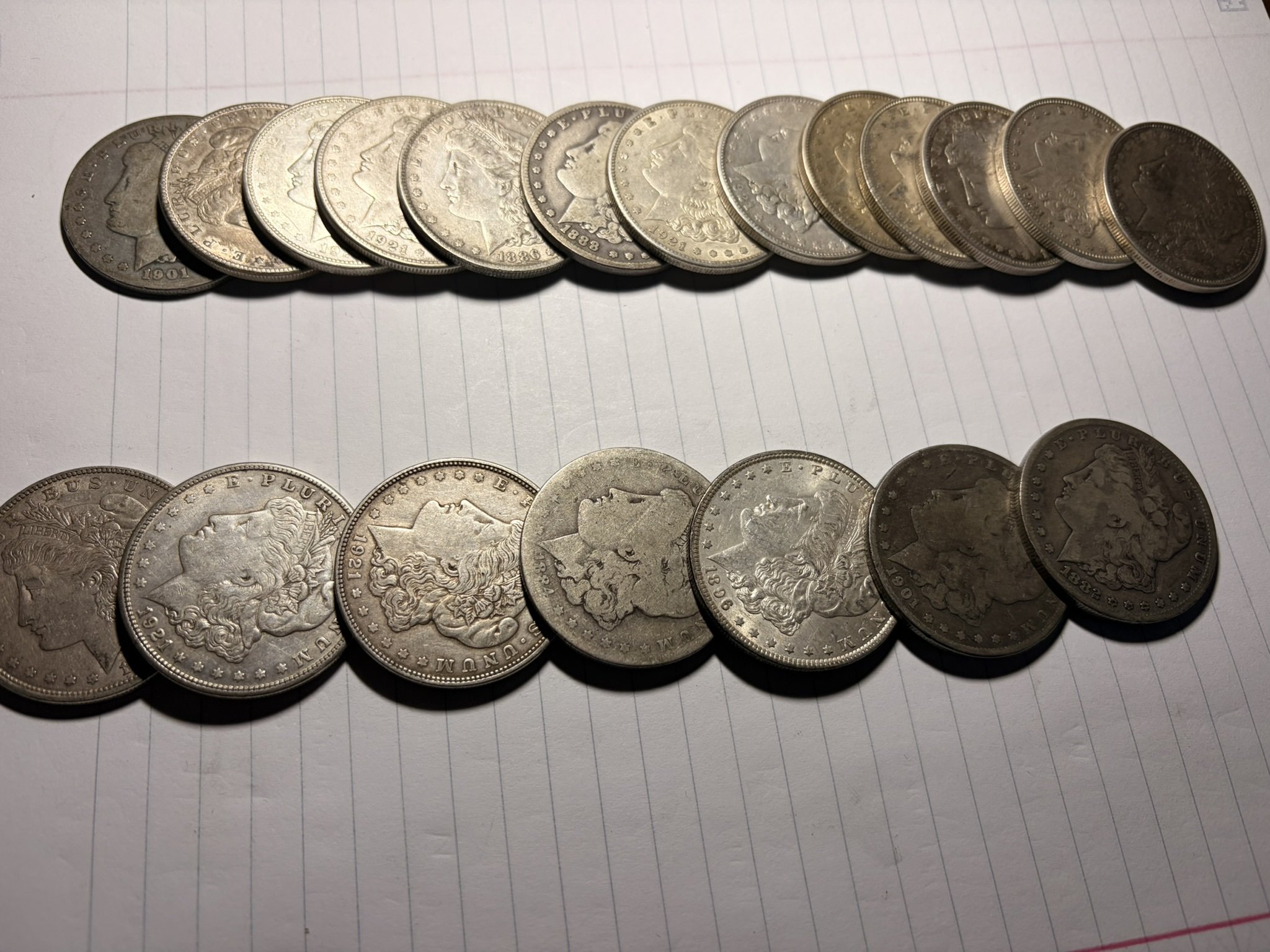 20 Morgan Dollars 1882-1921 (melt 37-39 - collecting value 44-50 the 1886-o & 1900-s worth $100 or more?