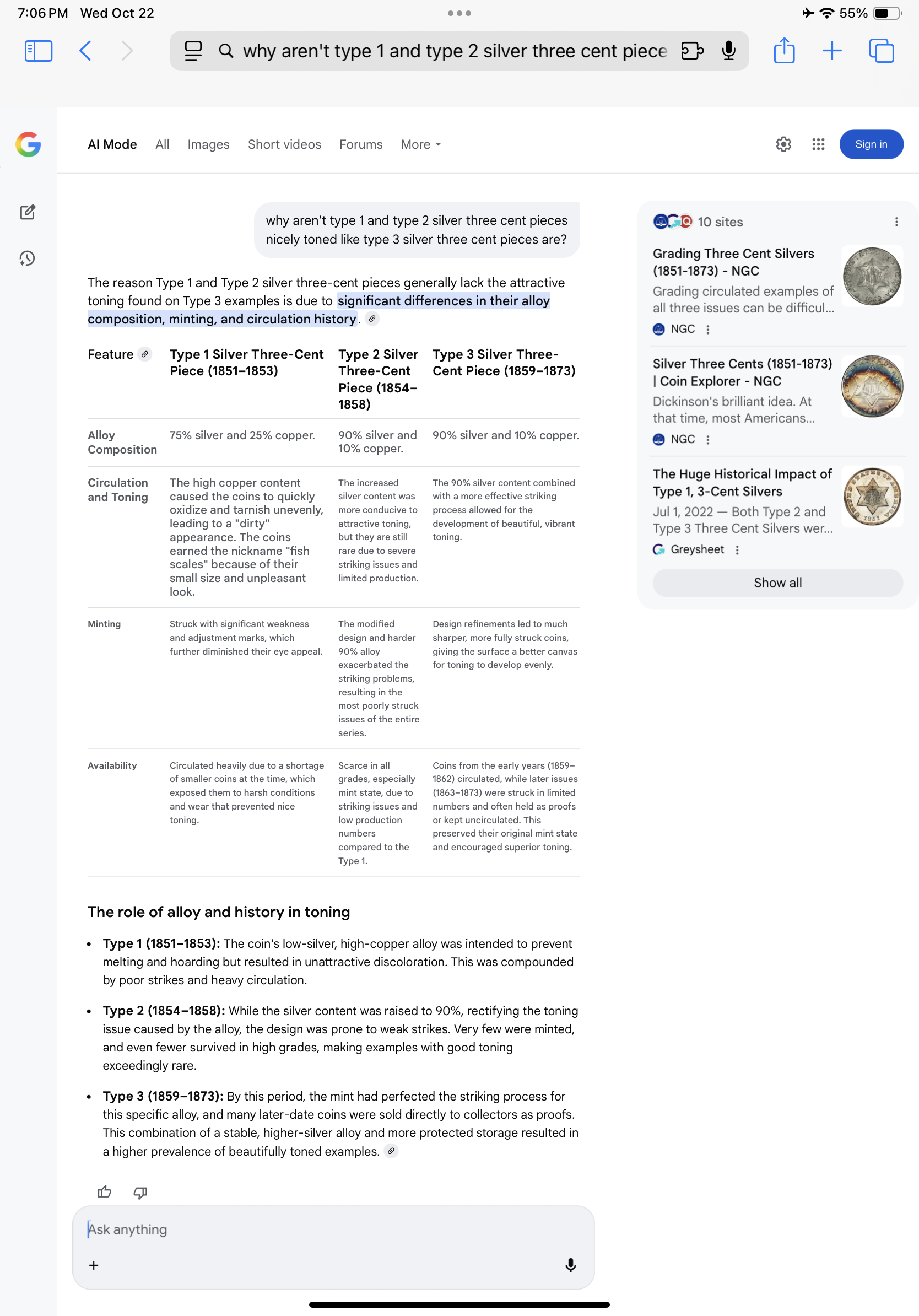 I know a thing or two, but I’m not a professional numismatist by any stretch and am well aware of my knowledge gaps, so being cited in the AI response to a question I myself was asking was pretty eye opening.