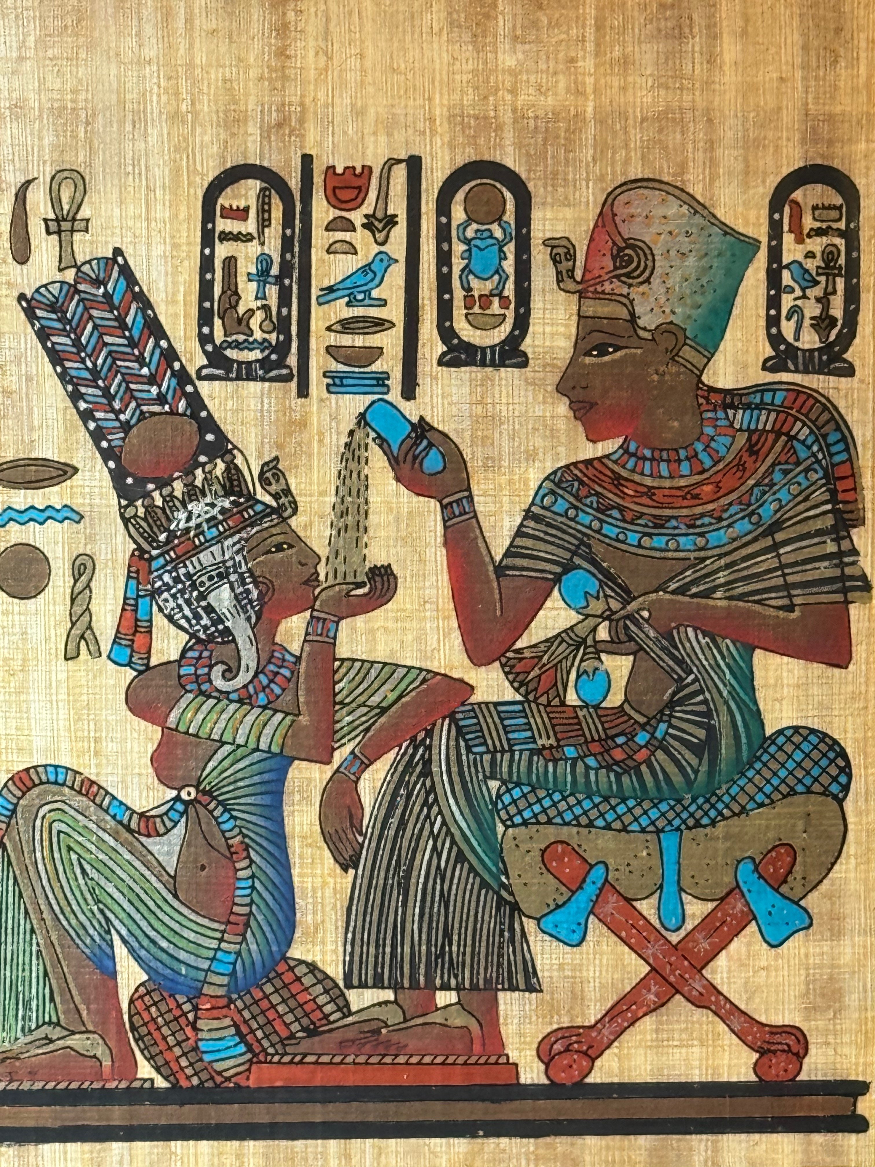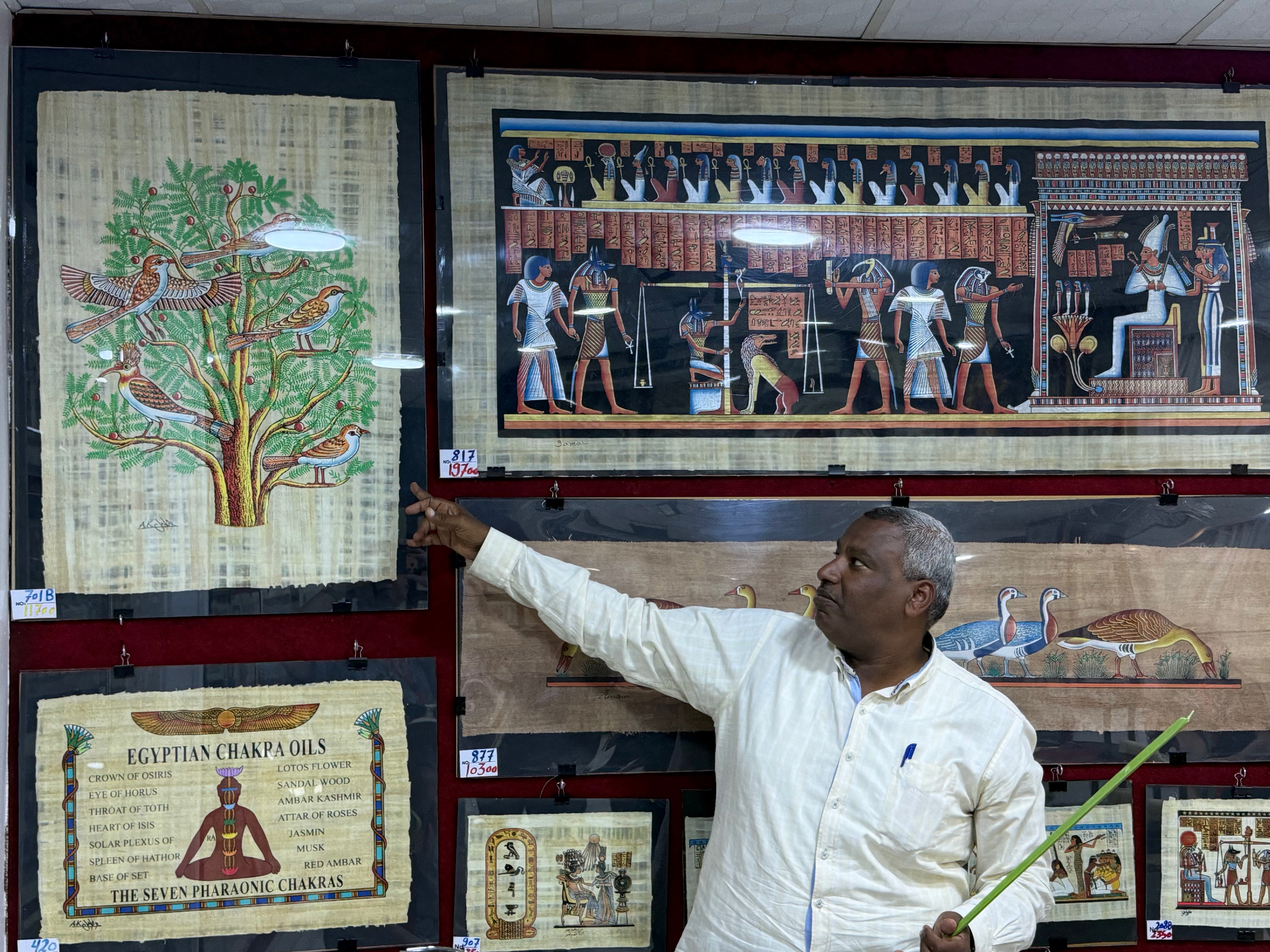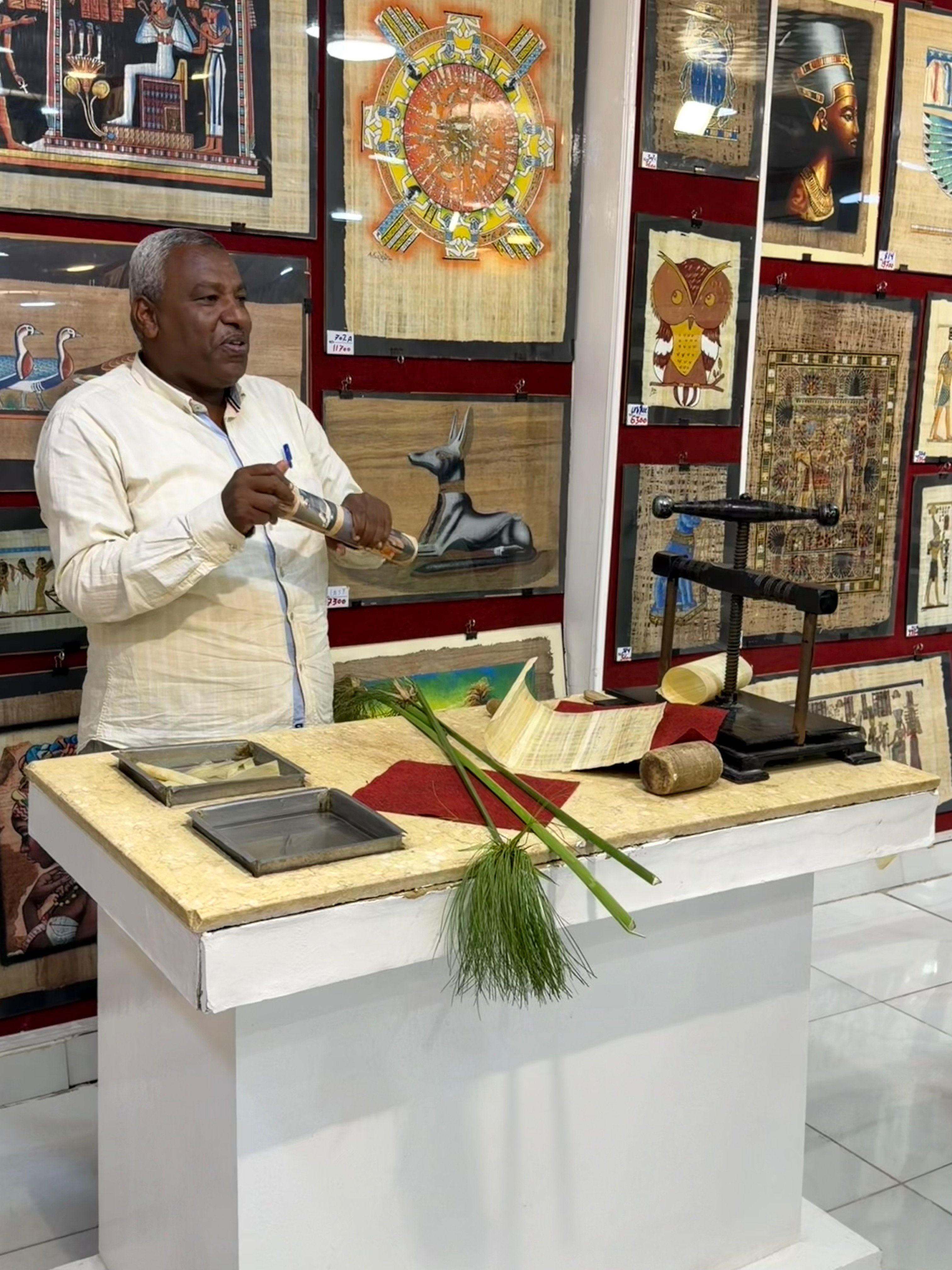 The Master Papyrus Craftsman Demonstrates how Papyrus Paper id made from Papyrus reeds and then offers examples of Egyptian artwork on Papyrus: