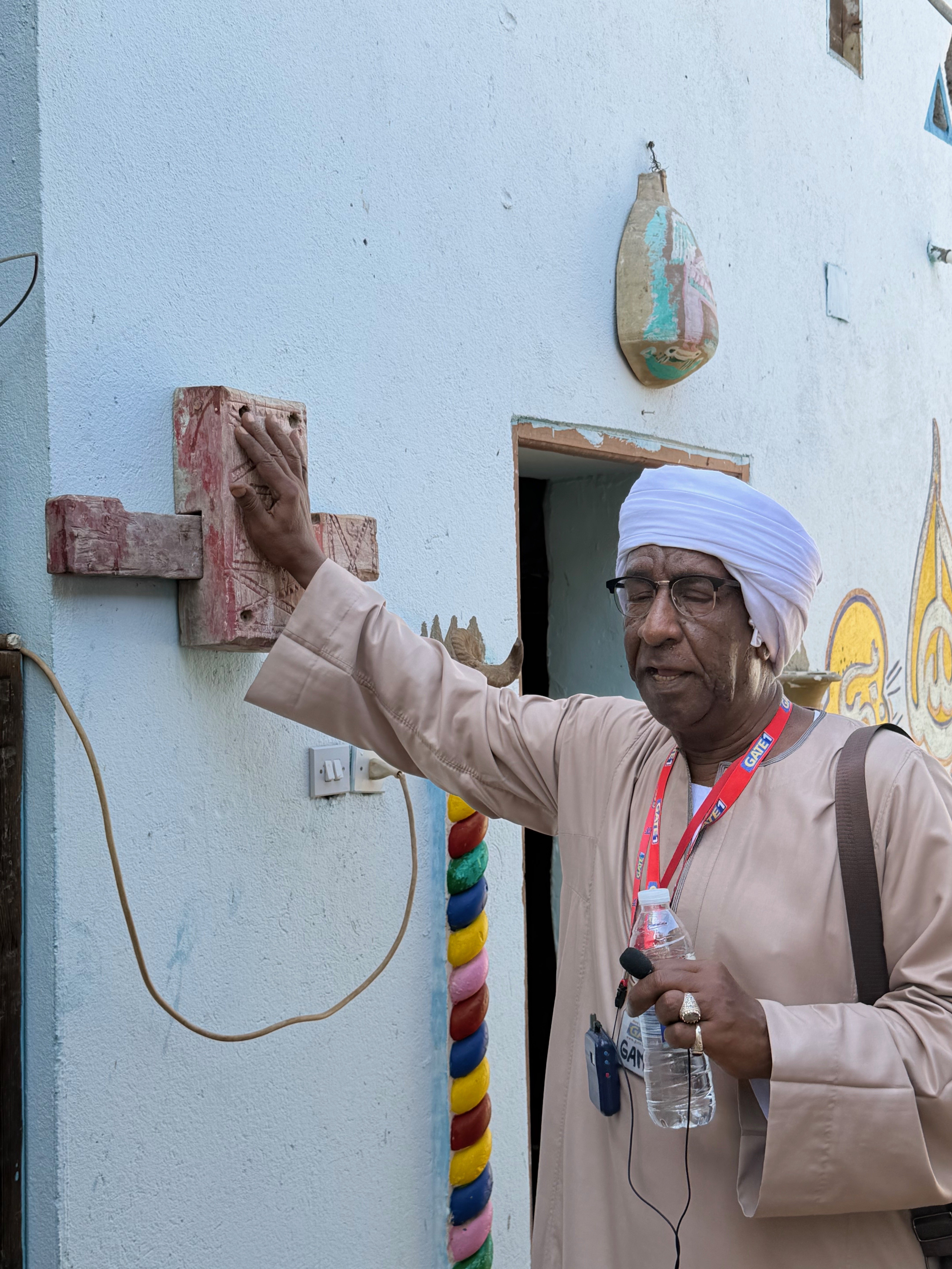 The Nubian guide points out that his people are well;coming off all faiths as represented by this door lock in the shape of a cross with both a Star of David and a Crescent embossed on it: