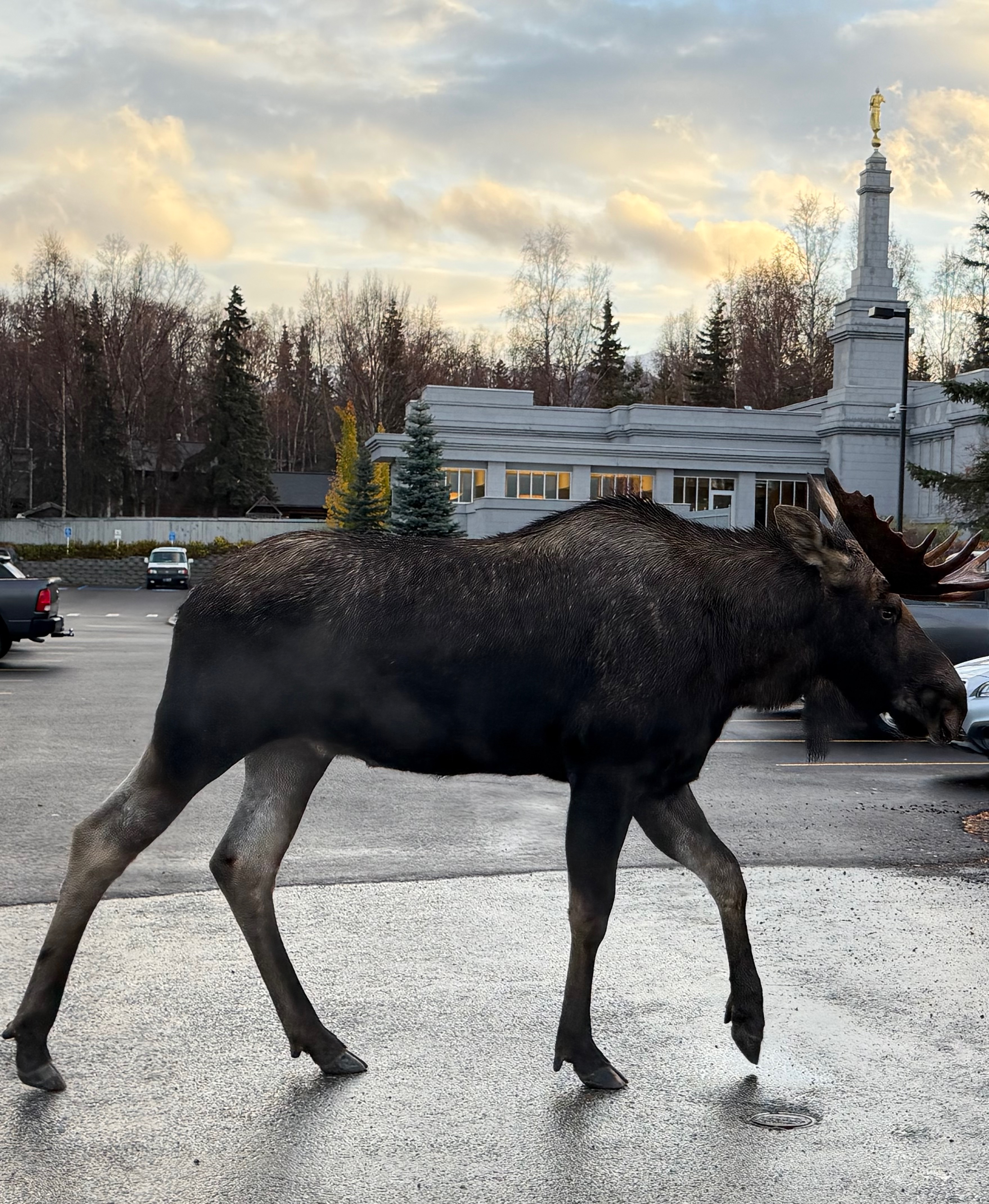 Capping off yesterday's capturing on video from my office a pair of F-22 Raptor Fighter Jets flying in tandem, only to be followed by a Mt. McKinley revealing sunset and then this morning's cosmic orange sunrise - while on an early morning errand I came face-to-face with this majestic moose:
