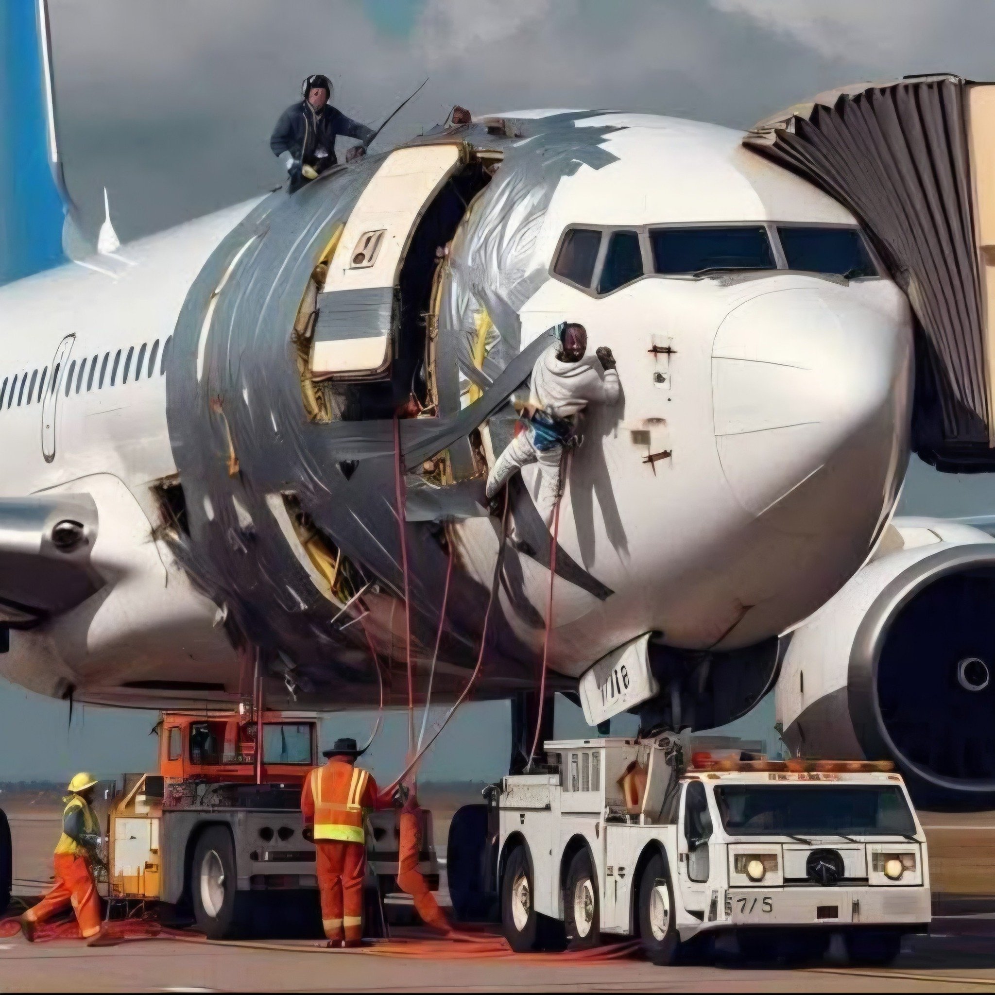 It also looks like the person at the front side of the plane is duct taped to the aircraft outer side too, Maybe Mel Brookes was filming a movie on how not repair a plane