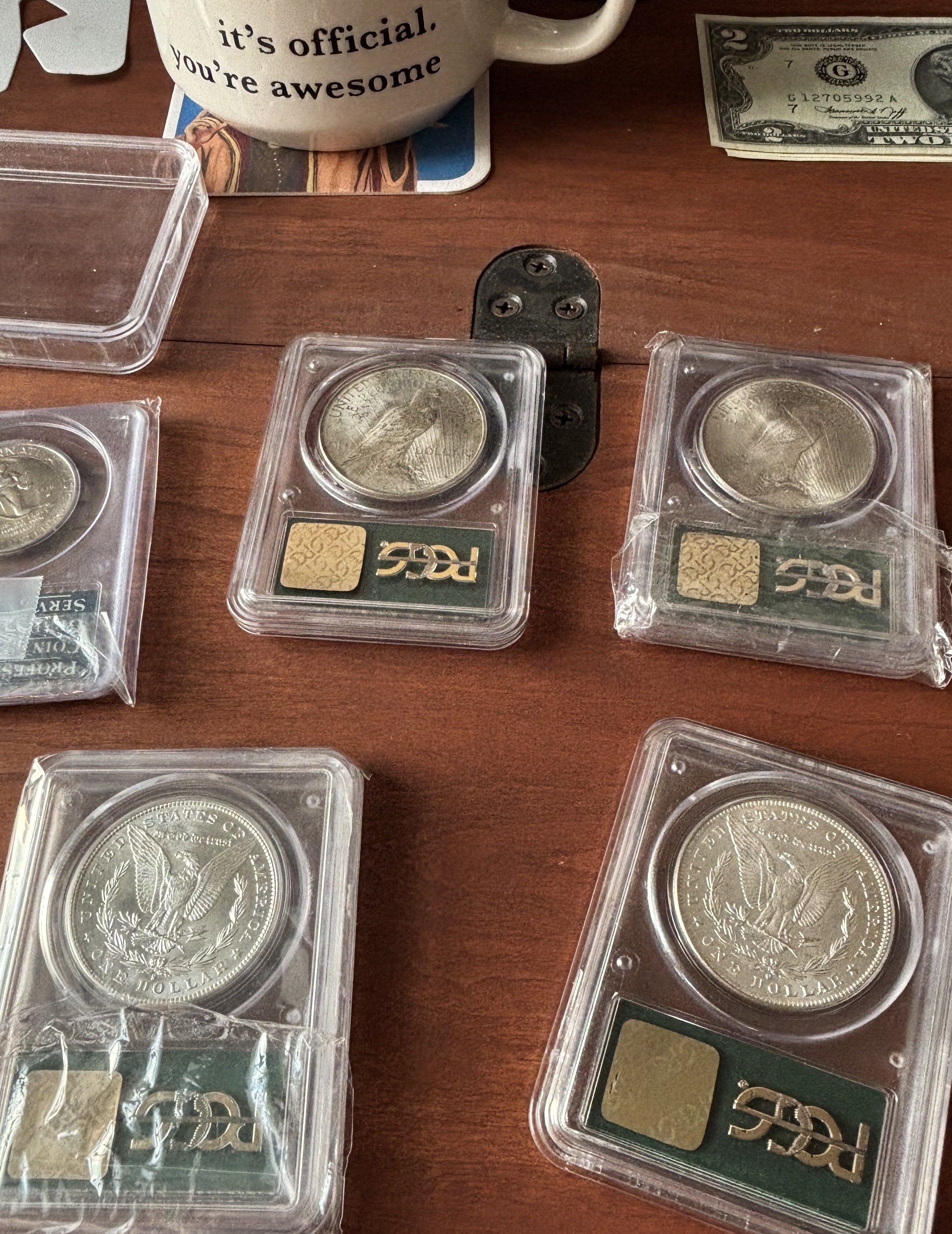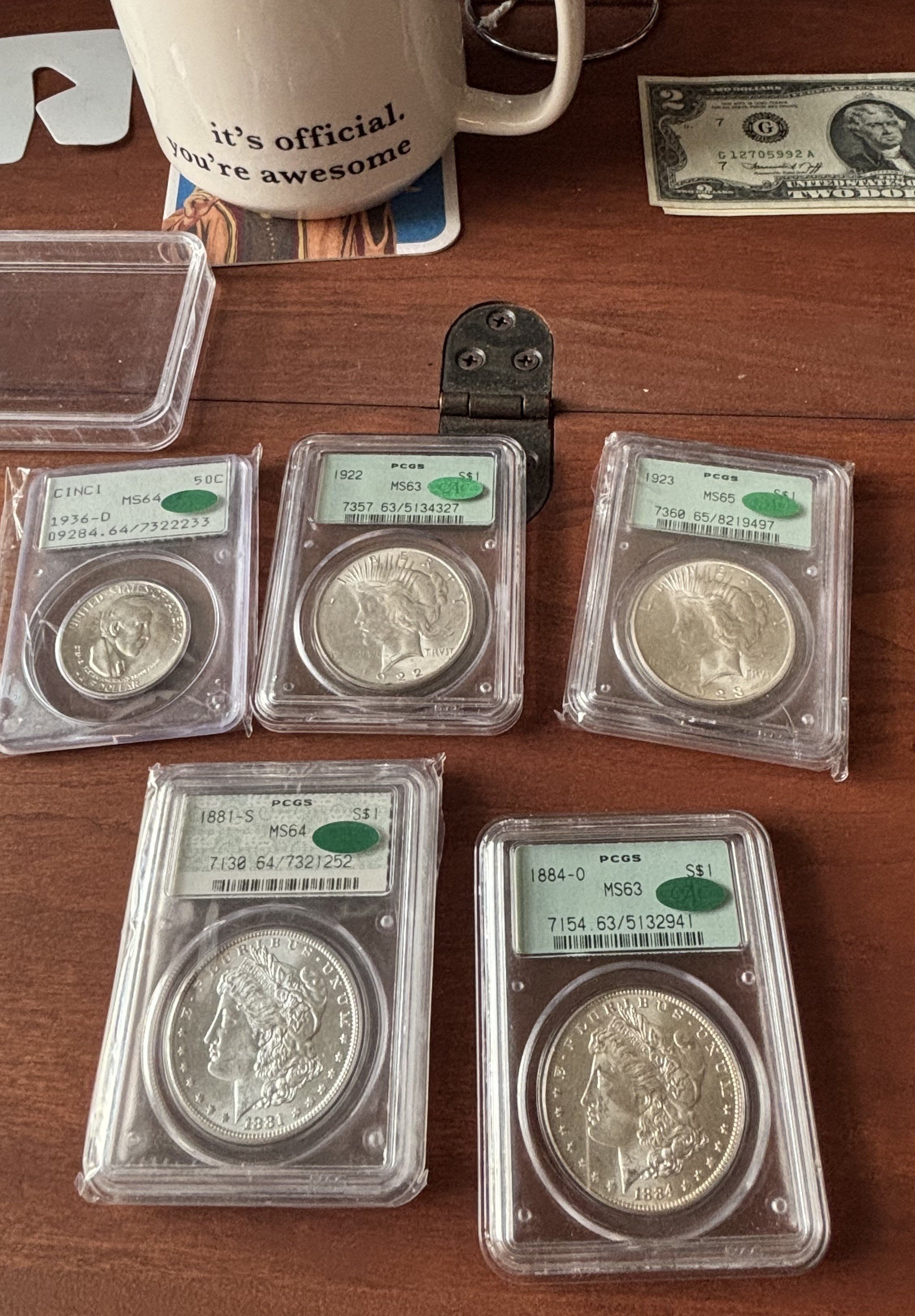 Good morning to all. Temps have dropped. Done with 90 minutes on the Peloton. Done with coffee, and time to play with some of the new "old holders" that have arrived. My first Doily and it looks nice. Also my first scarce Gen 2.2 holders. Added another CAC Ratt Commem to the set as well.