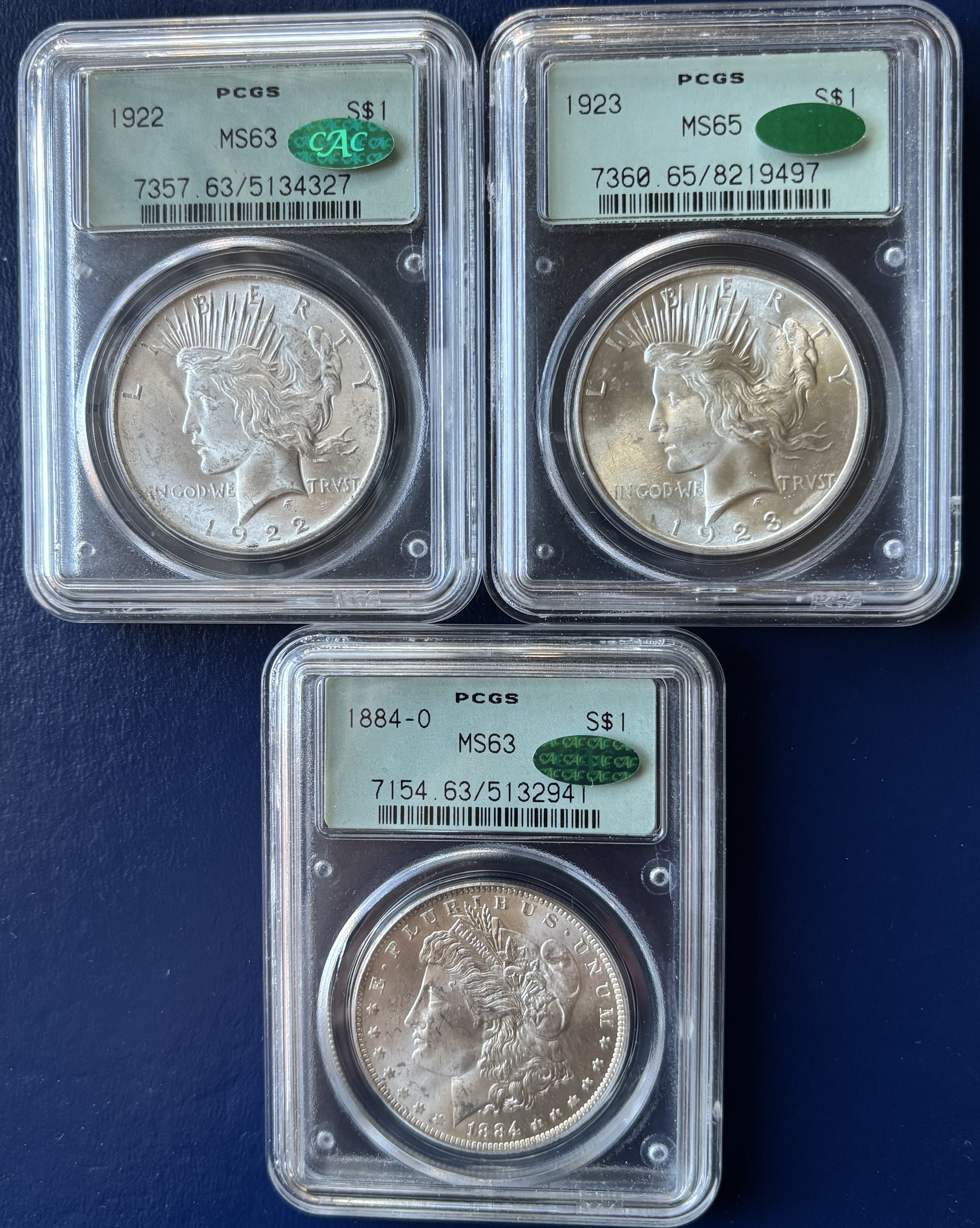 Your 1886 Morgan is in a 2.1A holder. That came right after the Doily. It was used from Oct 89 to Dec 89. You can tell because your label does not say PCGS at the top, compared to my Peace Dollar. If it did then it would be a 2.1B. If you check the sides of the label you can figure out if it is a 2.1 or 2.2. A 2.2 label is machine cut. See how yours has perforations.
