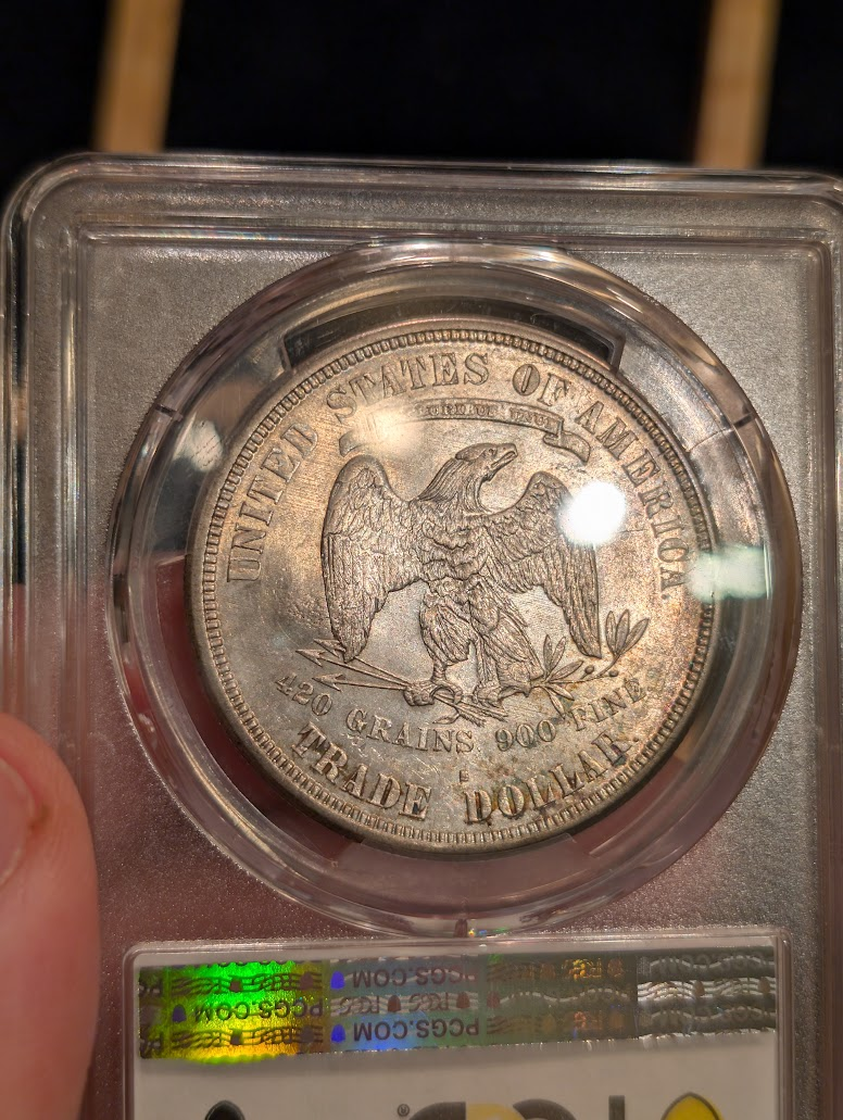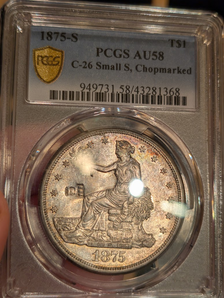 A new addition for my circulated (but not chopped) trade dollar album. At first glance, a common date. But this is the type 2/2 with Large S mm, the second scarcest variety for the date behind the famous DDO.