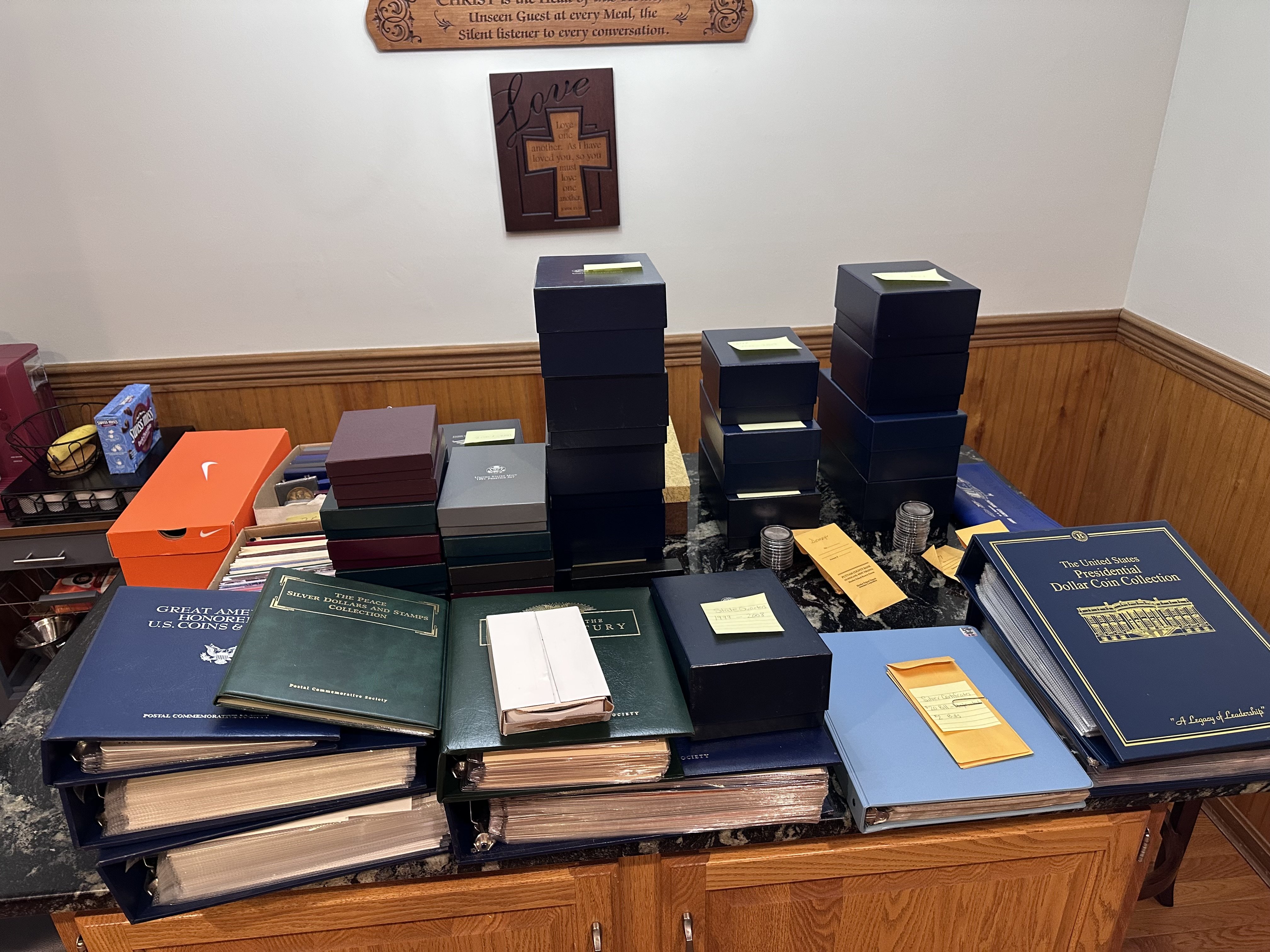 I see what could be all 15 prestige sets, some small stacks of ASEs maybe. Lots of mint sets. Hard to say if proof storage boxes will have clad or silver proofs or both. And I bet the coins in the albums with stamps are cleaned.