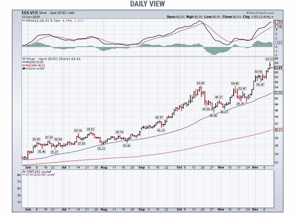 The latest silver chart shows the nosebleed may be over, and we are back in an uptrend above the 50 day moving average.