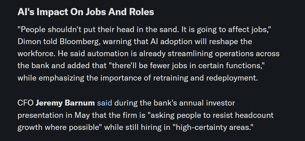 "People shouldn't put their head in the sand. It is going to affect jobs," Dimon told Bloomberg, warning that AI adoption will reshape the workforce. He said automation is already streamlining operations across the bank and added that "there'll be fewer jobs in certain functions," while emphasizing the importance of retraining and redeployment.