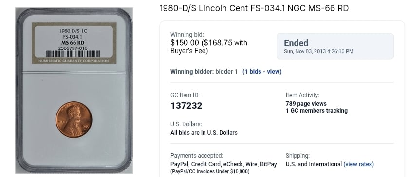 Debunked variety. 1980-D/S 1C FS-034.1. Not sure exactly how many NGC slabbed before they delisted it, but it wasn't a whole lot, around 30 in all grades. Previously sold on GC for ~$150 in 2013. I paid $30 for it at the start of summer off eBay.