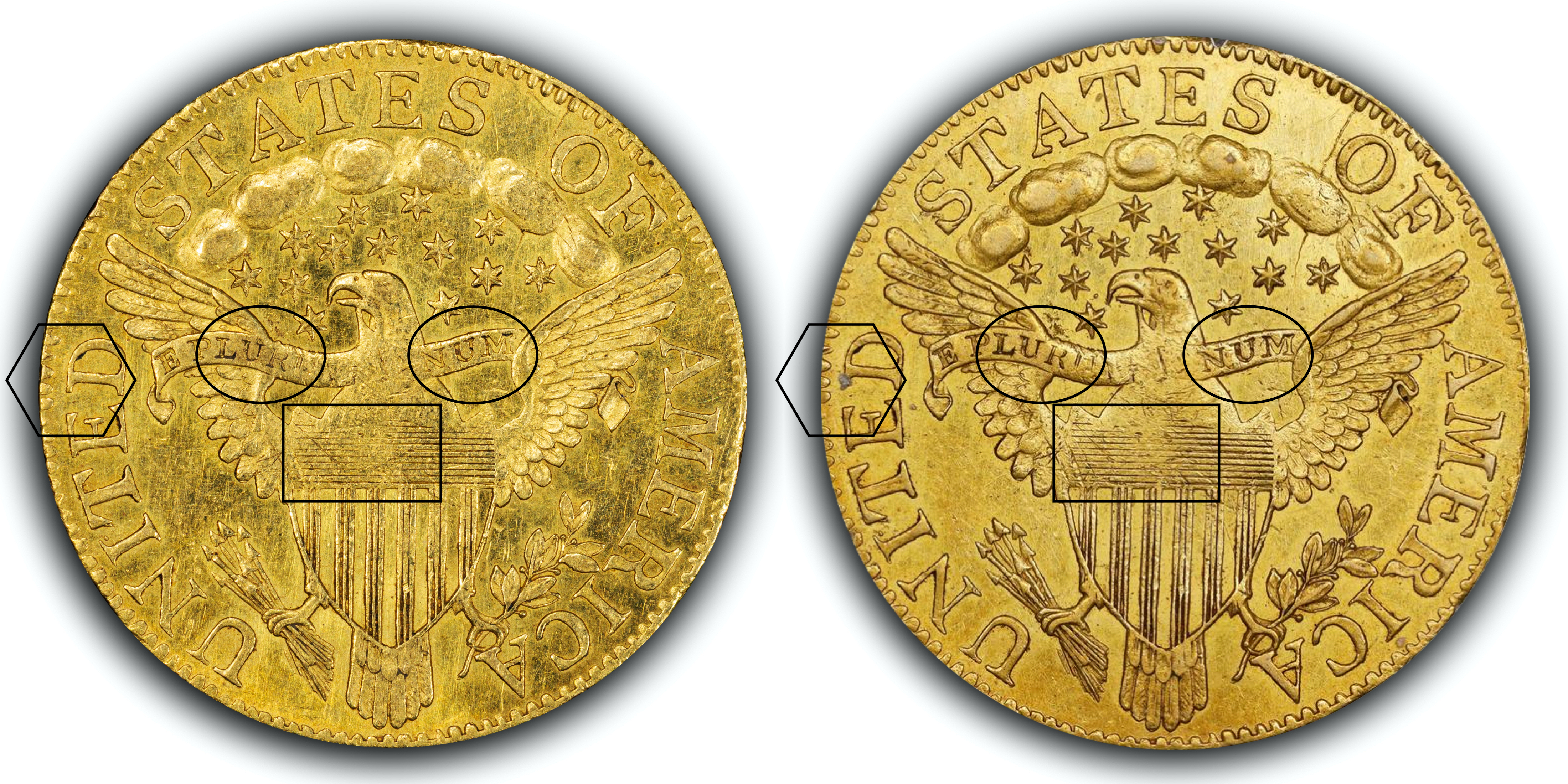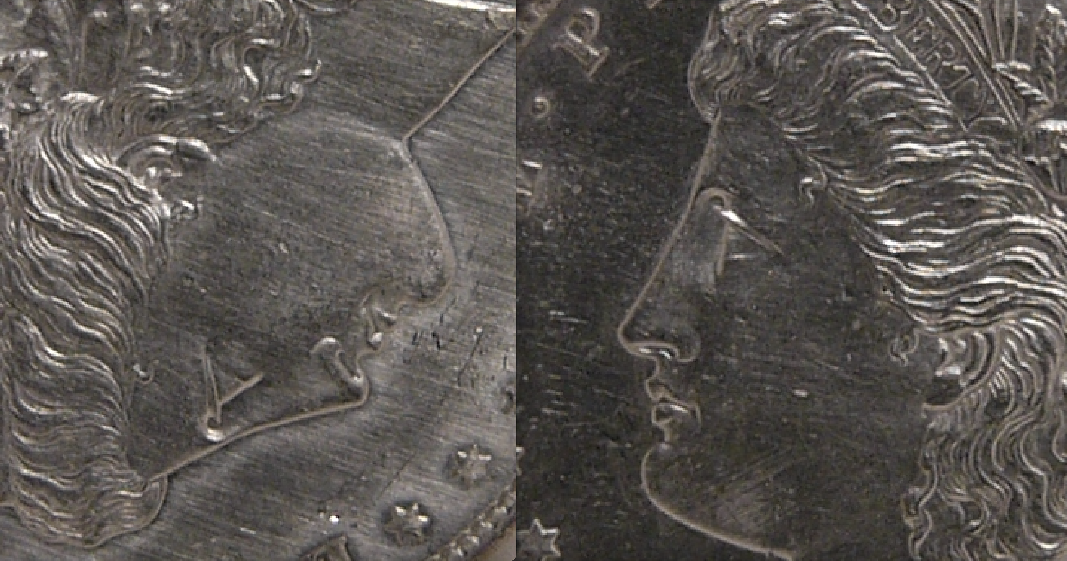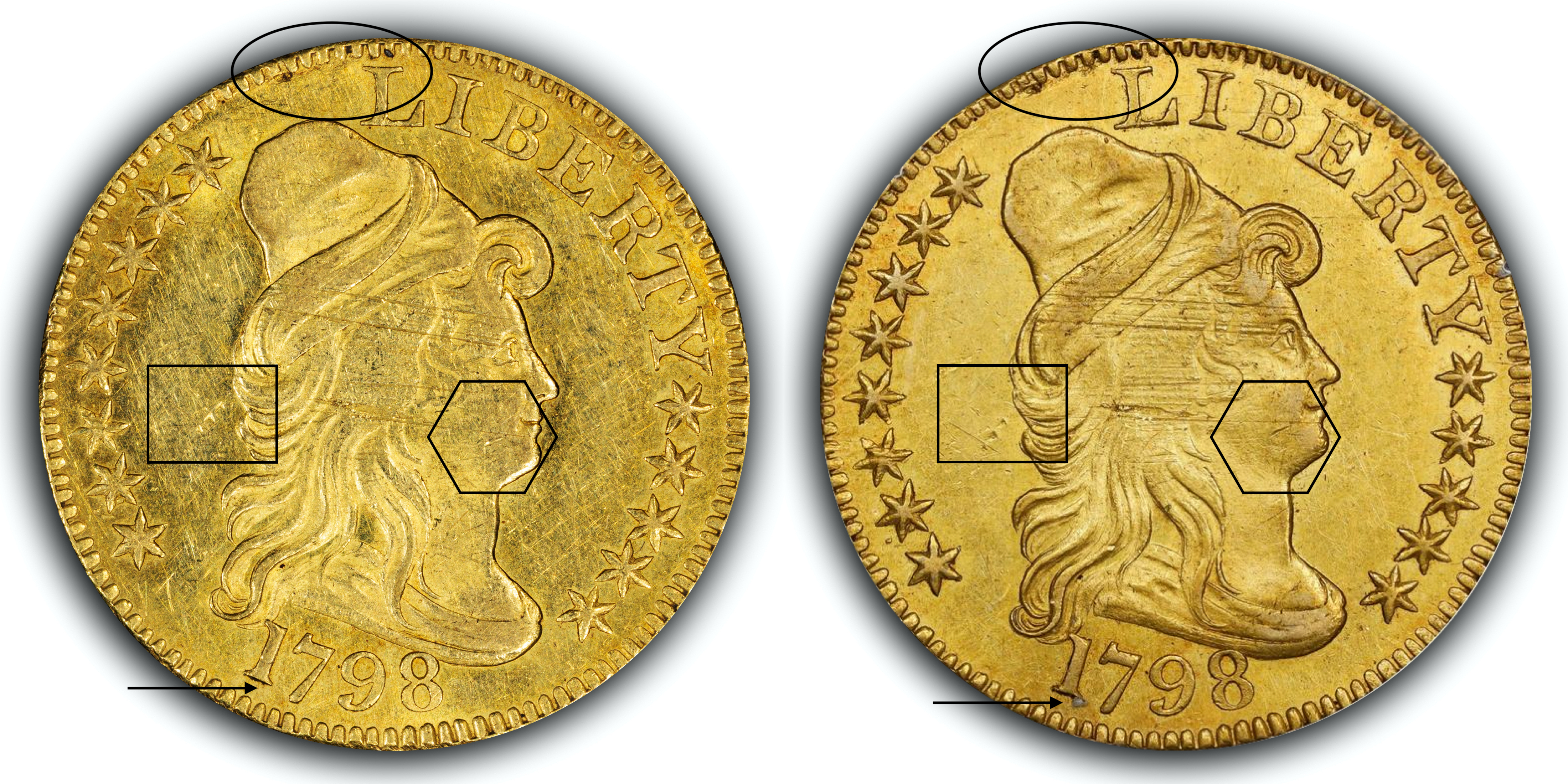 The ovals show dirt or debris in an around denticles, the rectangles show a prominent milling mark in the field, and the hexagon shows a decent whack on the cheek. The difference between the two appears to be that some grey schmutz was removed by the date (arrow).