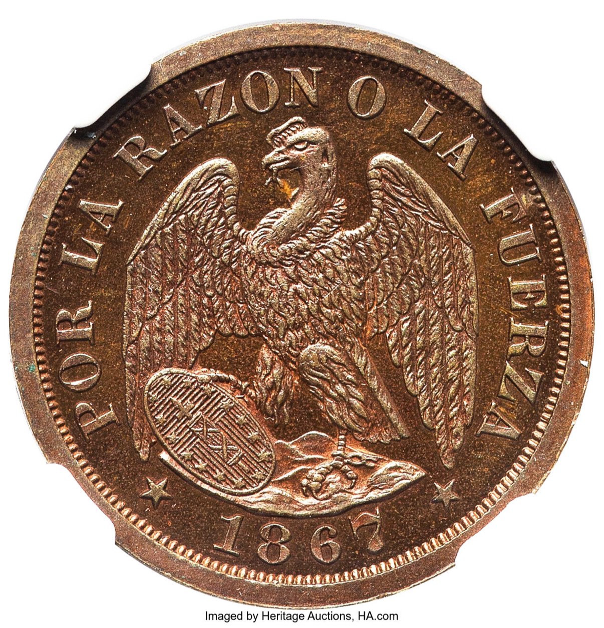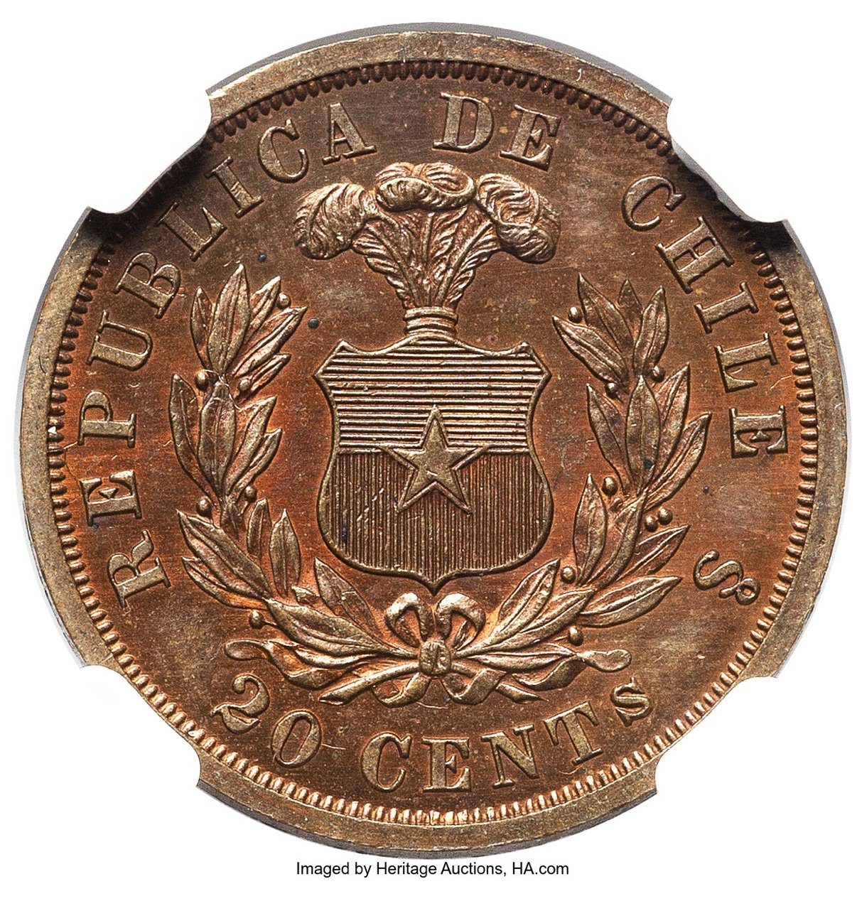 Another very rare Chilean copper pattern. The 20c has a documented population of 2, one from Longacres estate and one Linderman estate. A few examples are in the Banco de Chile which were probably samples sent by Longacre.