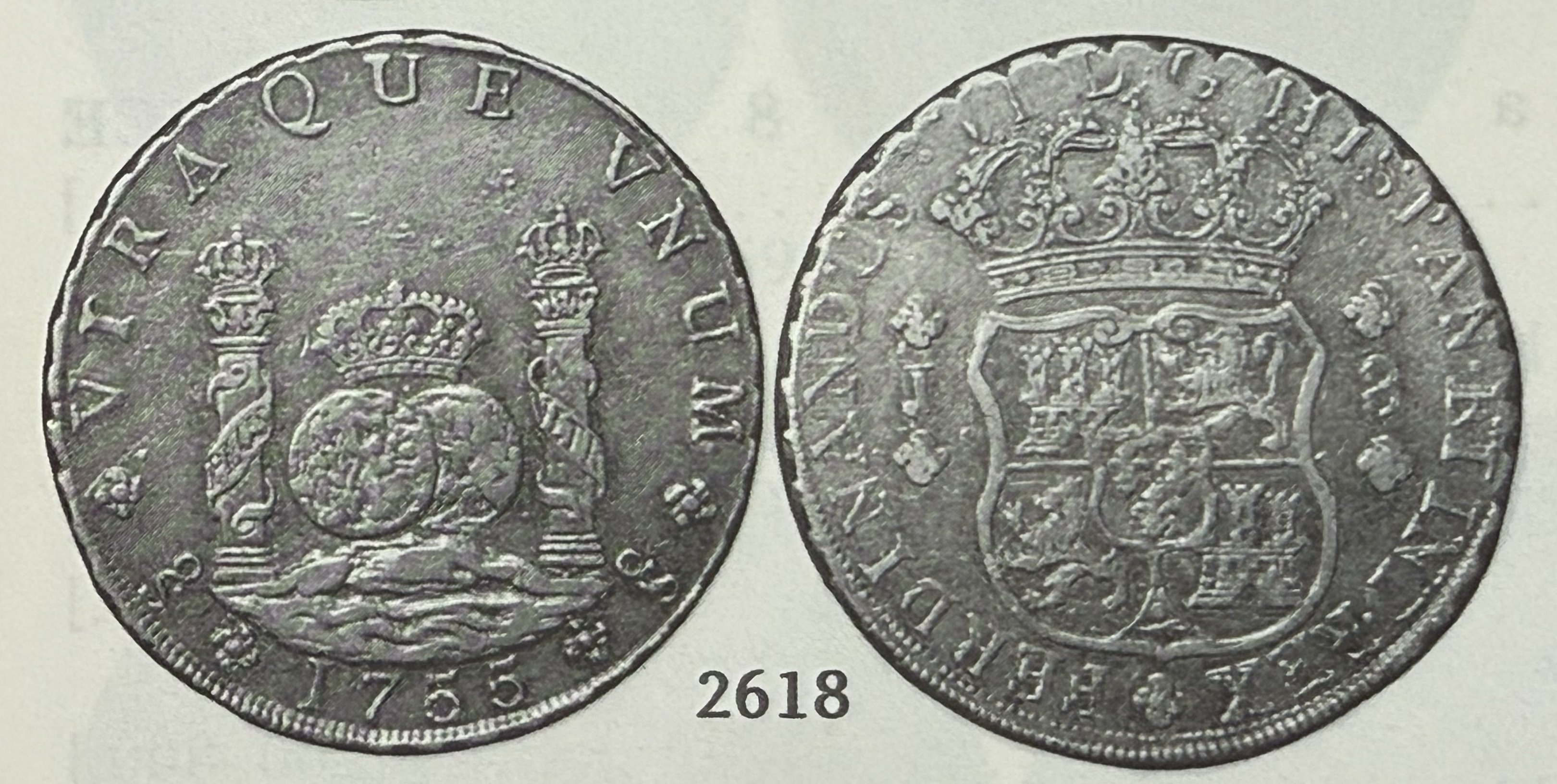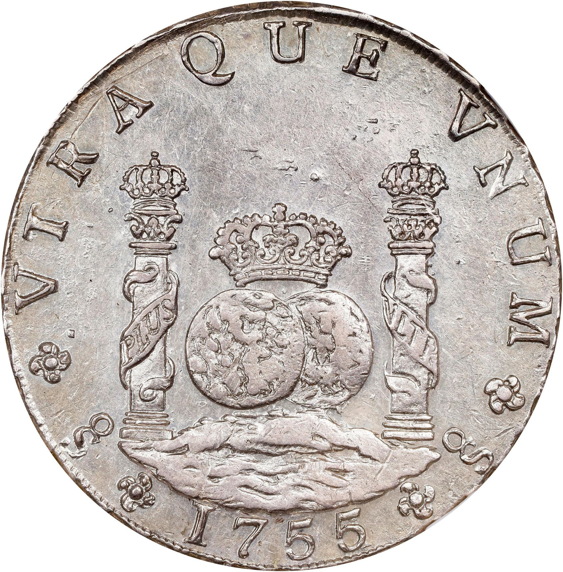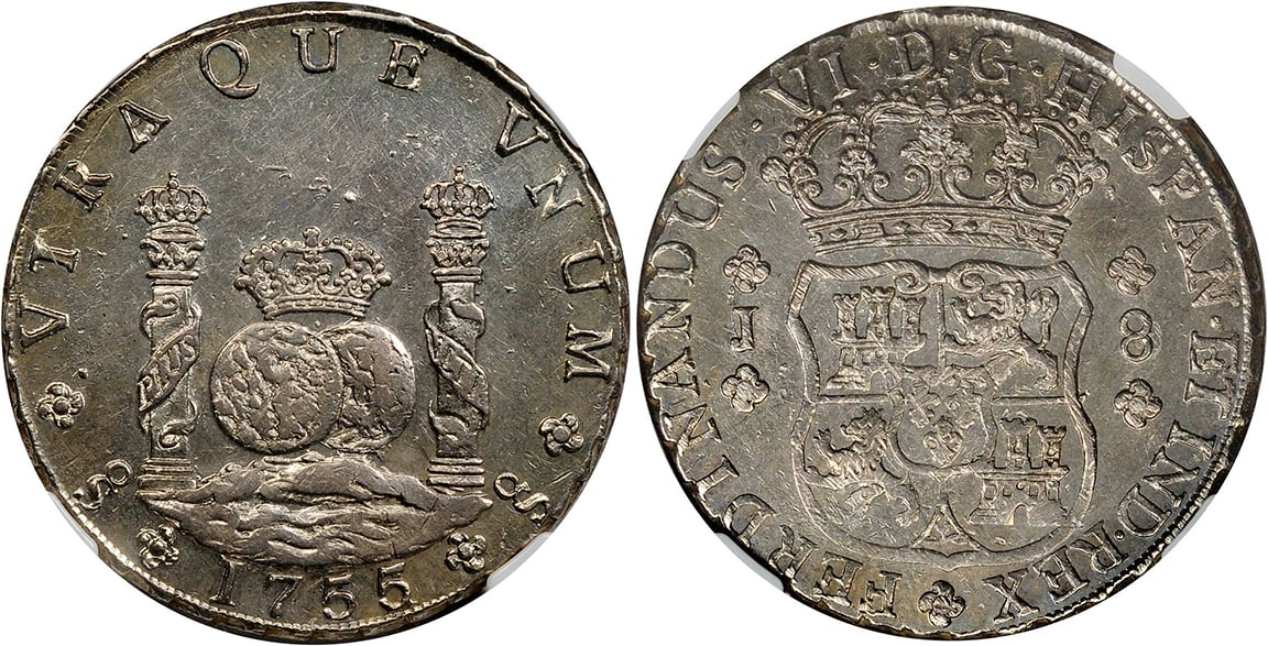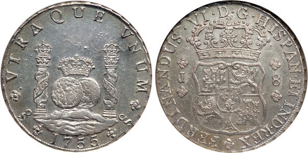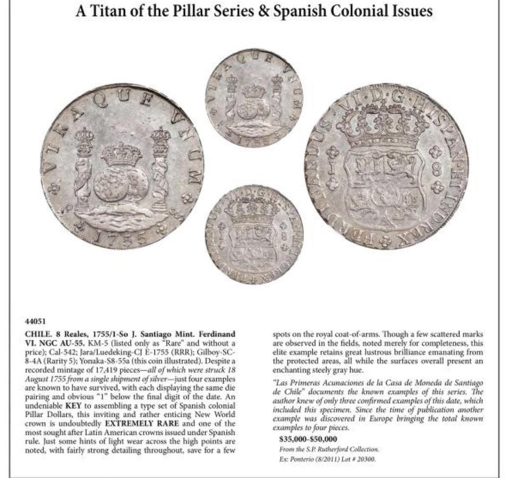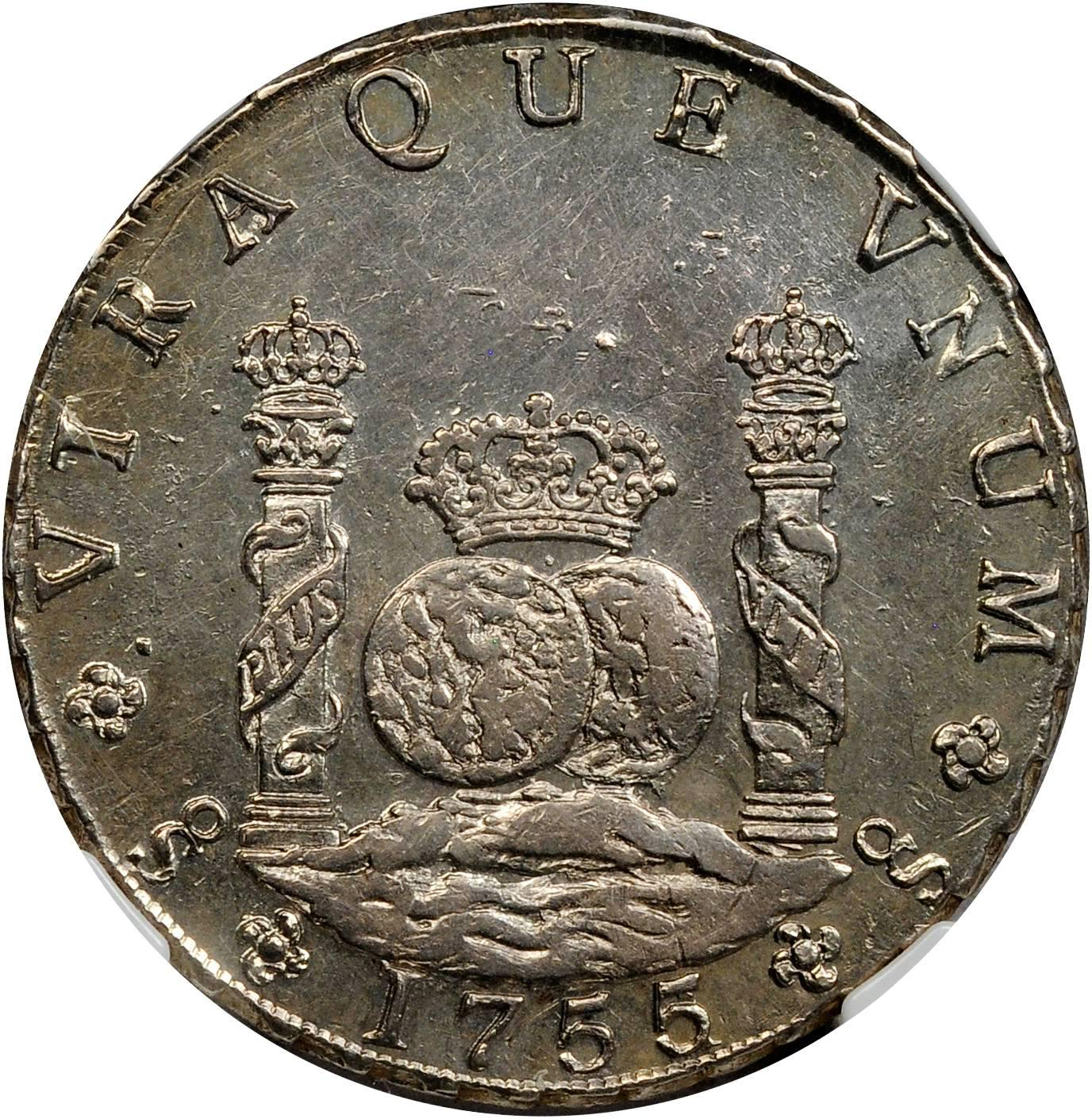 When the Sincona auction 100 posted a few weeks back, I was excited to see what seemed like a beautiful 1755/1 Santiago Pillar in AU58. This is a rare coin and well documented. In Carlos Jara's book, "Las Primeras Acunaciones de la Casa de Moneda de Santiago de Chile", he noted three specimens extant.