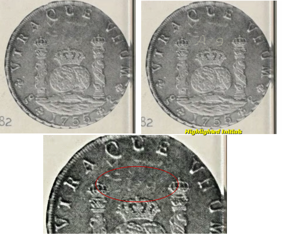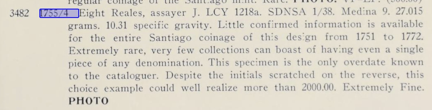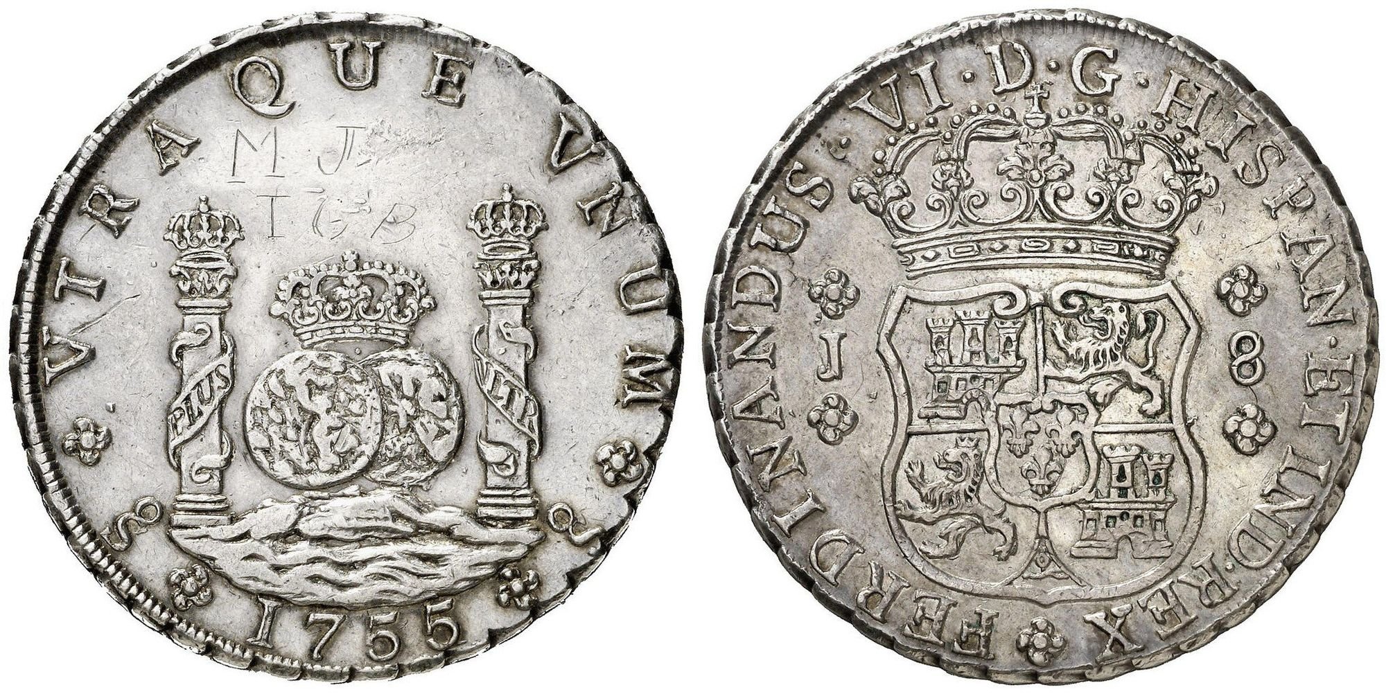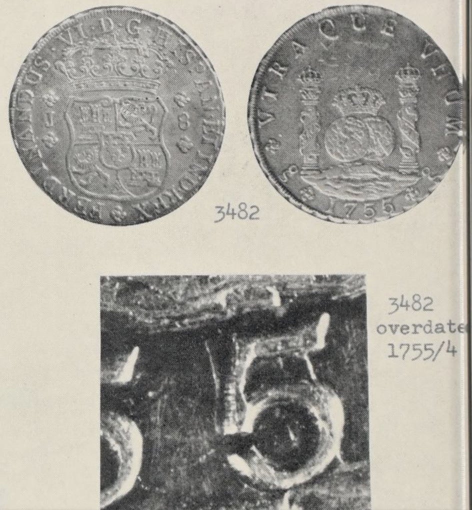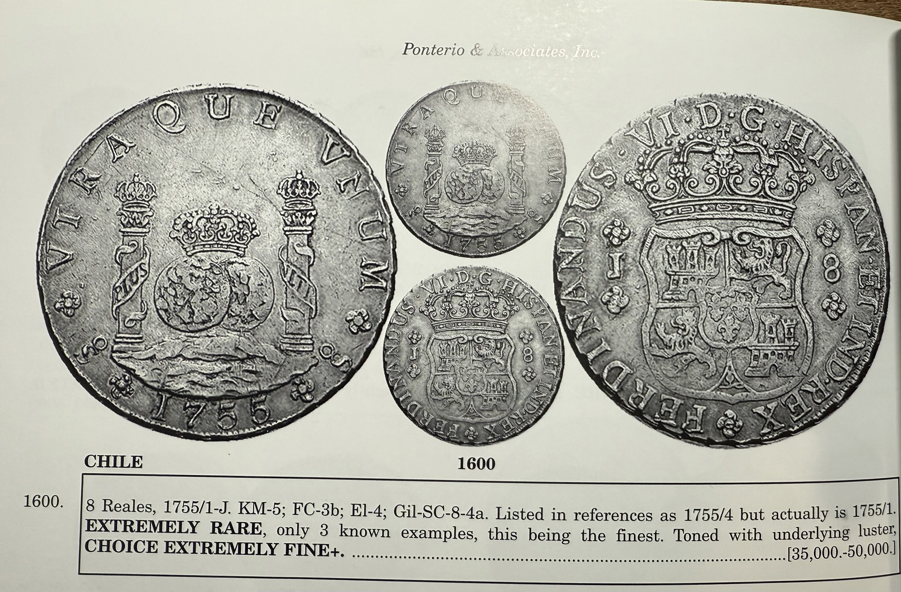 When the Sincona auction 100 posted a few weeks back, I was excited to see what seemed like a beautiful 1755/1 Santiago Pillar in AU58. This is a rare coin and well documented. In Carlos Jara's book, "Las Primeras Acunaciones de la Casa de Moneda de Santiago de Chile", he noted three specimens extant.