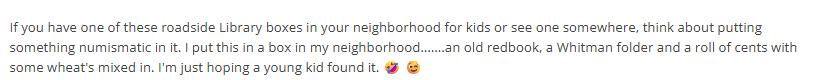 If you have one of these roadside Library boxes in your neighborhood for kids or see one somewhere, think about putting something numismatic in it. I put this in a box in my neighborhood.......an old redbook, a Whitman folder and a roll of cents with some wheat's mixed in. I'm just hoping a young kid found it. 🤣 😉