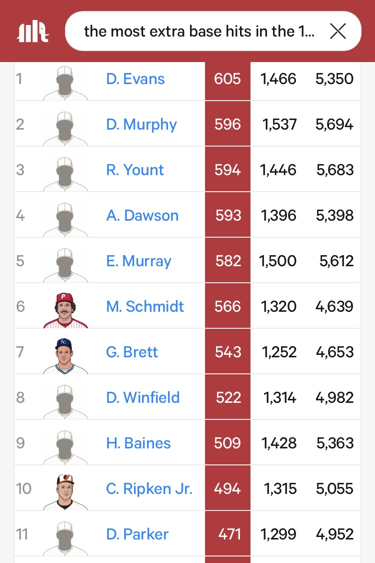 Evans had the most extra base hits in the 1980’s and Murphy was second. No small accomplishment when you consider players 3-11 are all in the HOF. 🍺