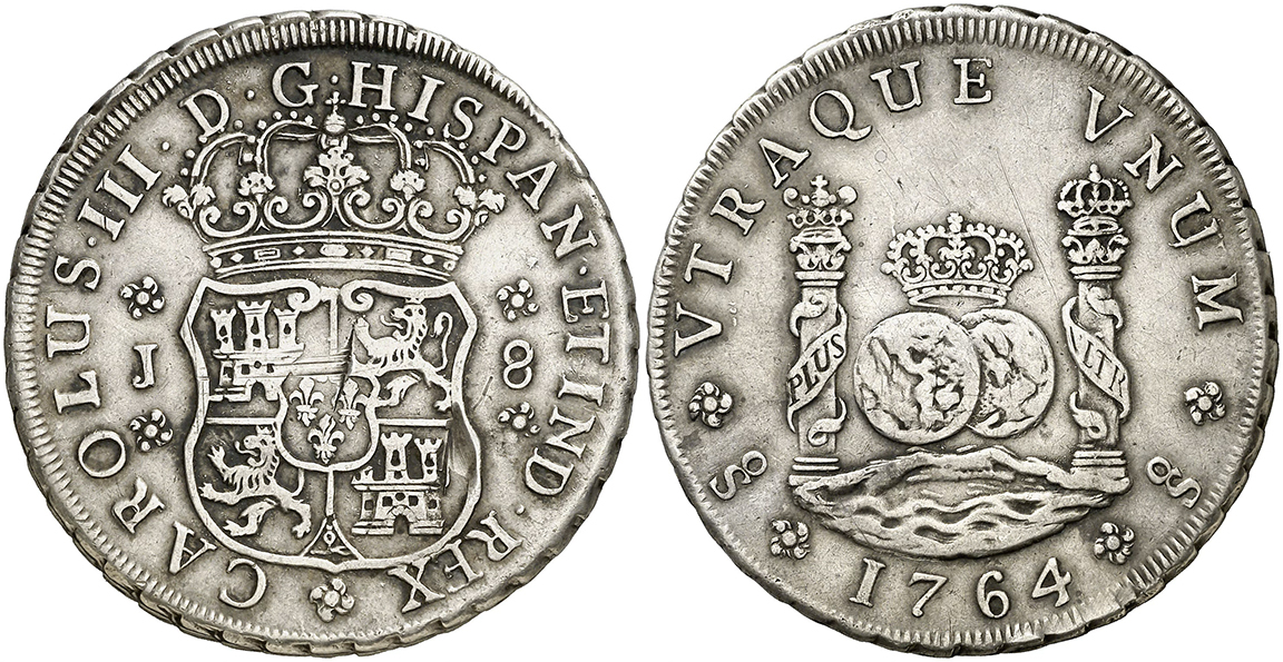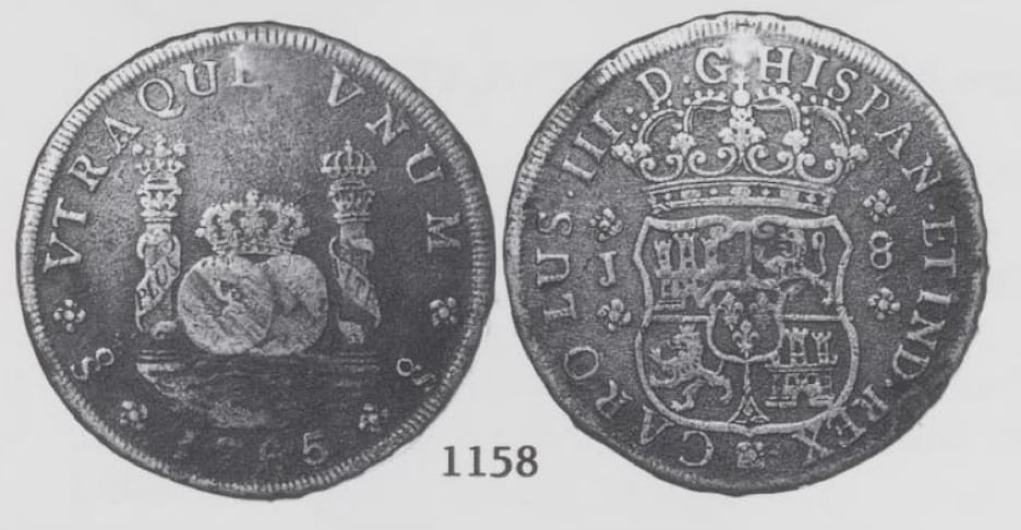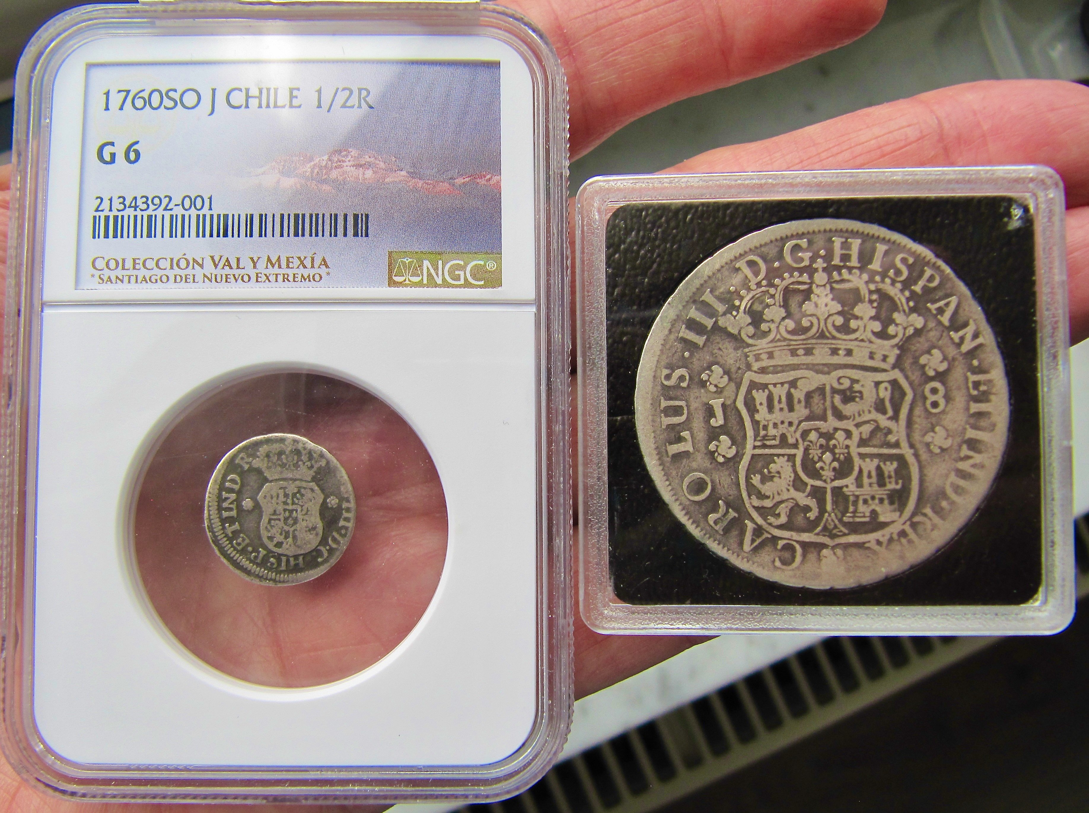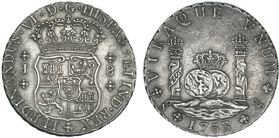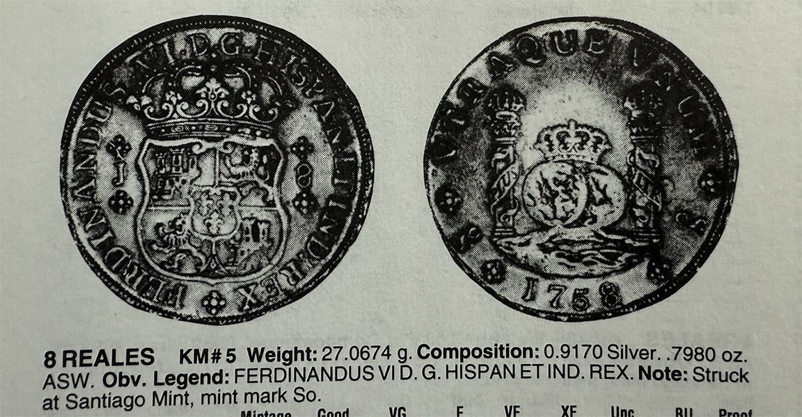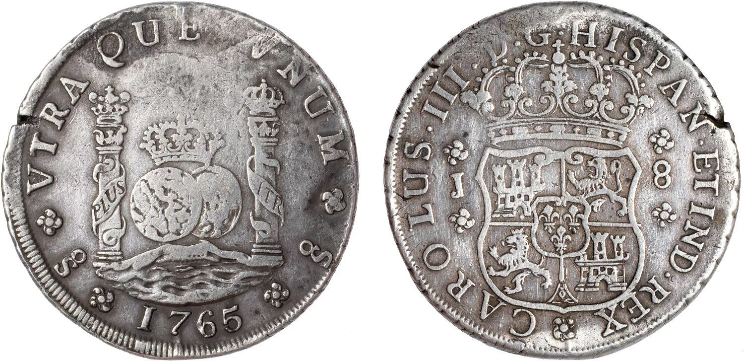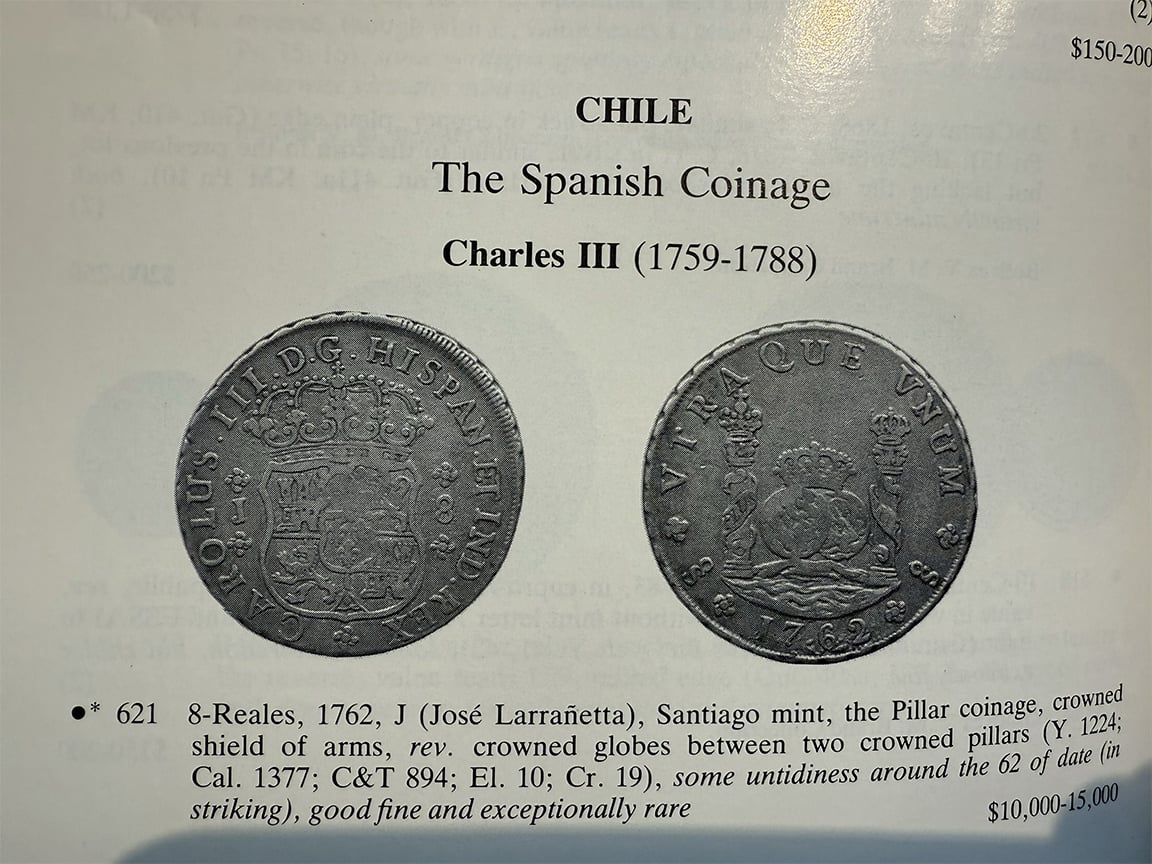 There are 13 dates included in the 8 Reales series, with two dates, the 1761 and 1769 reported to exist with previously no photographic confirmation. In 2023, I was sent a photo from a collector in Indonesia who dredges rivers to find coins. He showed me a picture of a 1769 Santiago Pillar. He rejected my offer to sell the coin and subsequently sold it to a wealthy Indonesian collector.