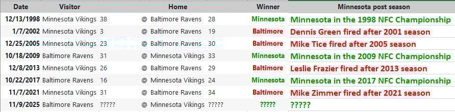 Here is a weird coincidence that I never knew about. For the Minnesota - Baltimore series, there are some big implications for Sunday's game: